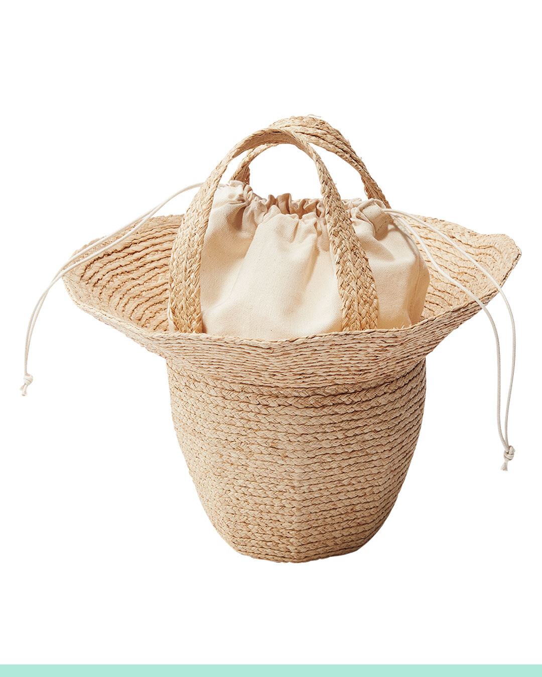帽子を逆さまにしたようなラフィアバッグは、木型を使用し職人がすべてハンドメイドで編み上げた逸品。コットンの巾着袋が内蔵されているので使い勝手も◯。