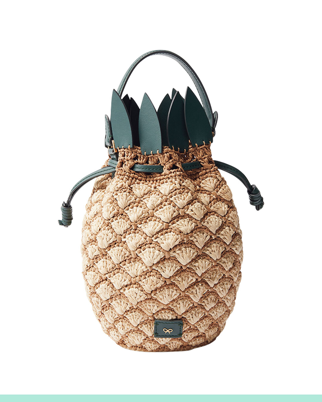 ラフィアを編み上げた本体にレザーの葉をあしらって、パイナップルをキュートに表現。