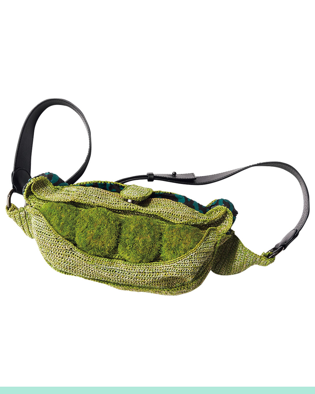 エンドウ豆の鞘を模したラフィアのボディバッグは、ポンポン製の豆部分までリアル&プレイフル!
