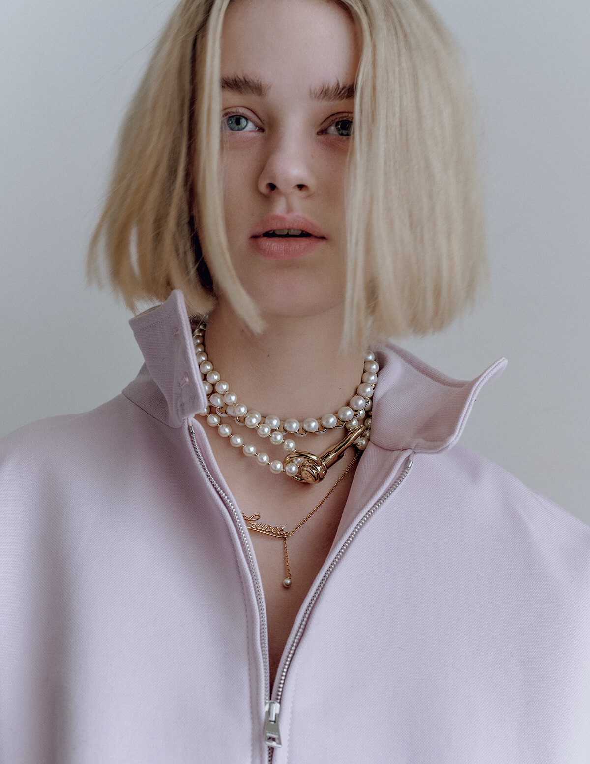 ハーフパールにゴールドをあしらったソリッドなチョーカーと、アイコニックなフックでパールを留めたパンキッシュなネックレスをレイヤード。「gucci」のレタードネックレスが90 年代風のムードを醸し出す。