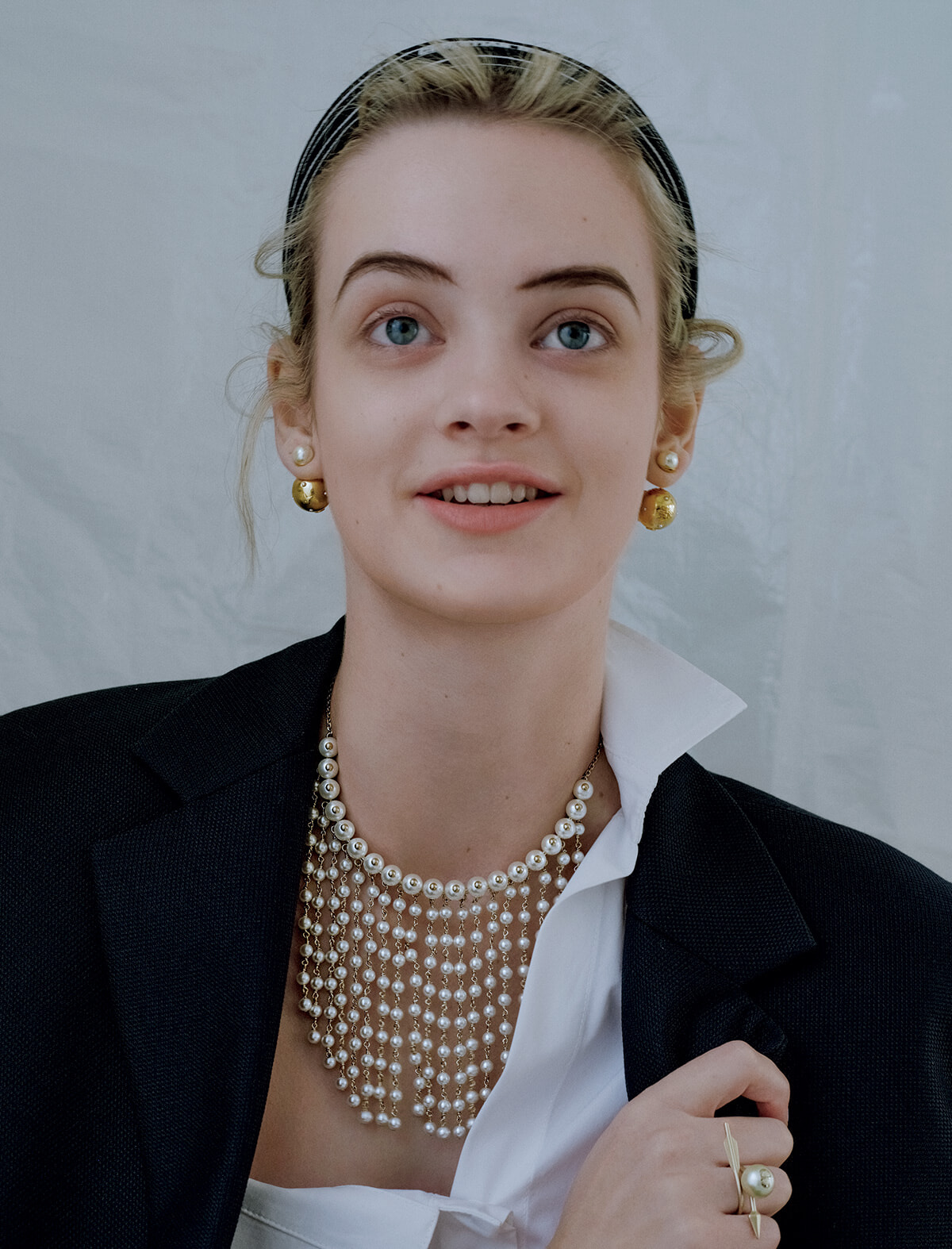 ピアス「ディオール トライバル」¥83,000、ネックレス「D‐ヴィニティ」¥340,000、同リング¥71,000、ヘアバンド¥66,000、ジャケット¥660,000、シャツ(参考商品)/以上ディオール(クリスチャン ディオール)