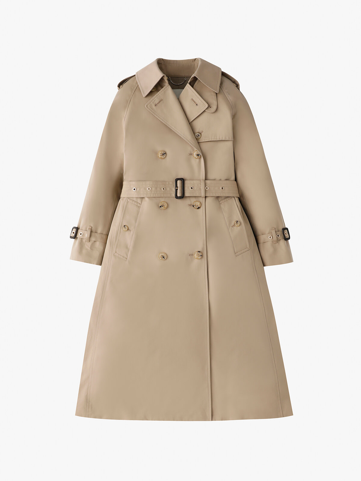 第一次大戦中、雨や風といった過酷な環境から英国兵士たちを守るために誕生したアクアスキュータムのトレンチコート。オリジナルのツイル素材「NEW AQUA TECH」で仕立てられた一着は、耐久力と撥水性に優れ、堅牢なつくりでありながらソフトでしなやかな風合いを実現。丸みを帯びたガンフラップや控えめに施されたエポレットなど、ベーシックな佇まいの細部にもブランドの美学が光る。長めに設計されたウエストベルトの結び方次第で、カジュアルからエレガントまでさまざまなスタイルに対応。膝にかかる程よいミディアムレングスゆえ、パンツスタイルはもちろんショート丈やロングのスカートともバランスよく調和する。