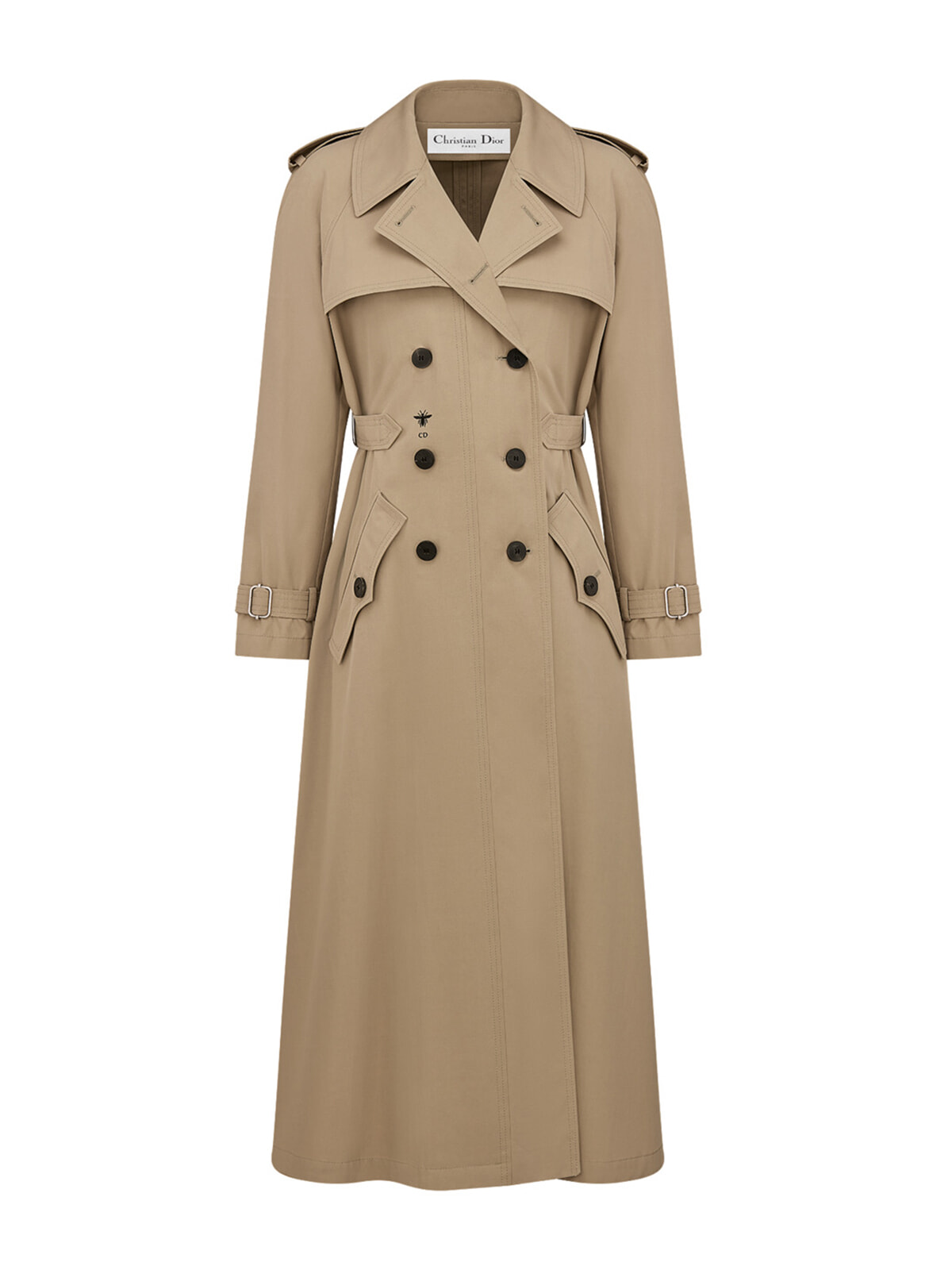 トレンチコートをワードローブのマストアイテムと位置付け、ヘリテージモデルから新作まで、多彩なデザインをそろえるディオール。ストームフラップやエポレットなど、ミリタリー由来のディテールを取り入れながら、メゾンのDNAであるエレガンスを加えた一着がこちら。両サイドにはベルト代わりとなるボタンタブが施され、ウエストのシェイプ具合でカジュアルにも、ドレッシーにも印象を切り替えられるところが魅力。キーシンボルとして愛される「ビー(ミツバチ)」の刺しゅうが、端正なスタイルに遊び心を添えるさりげないアクセントに。