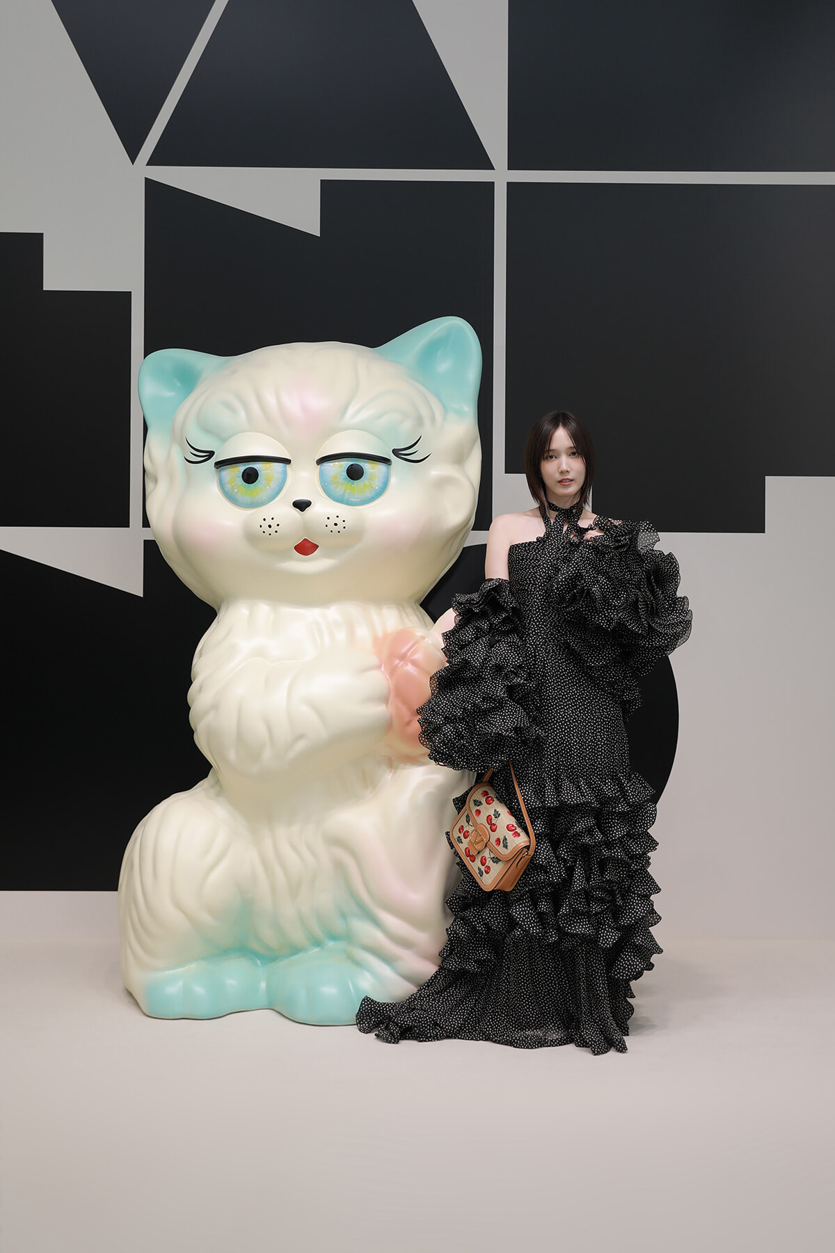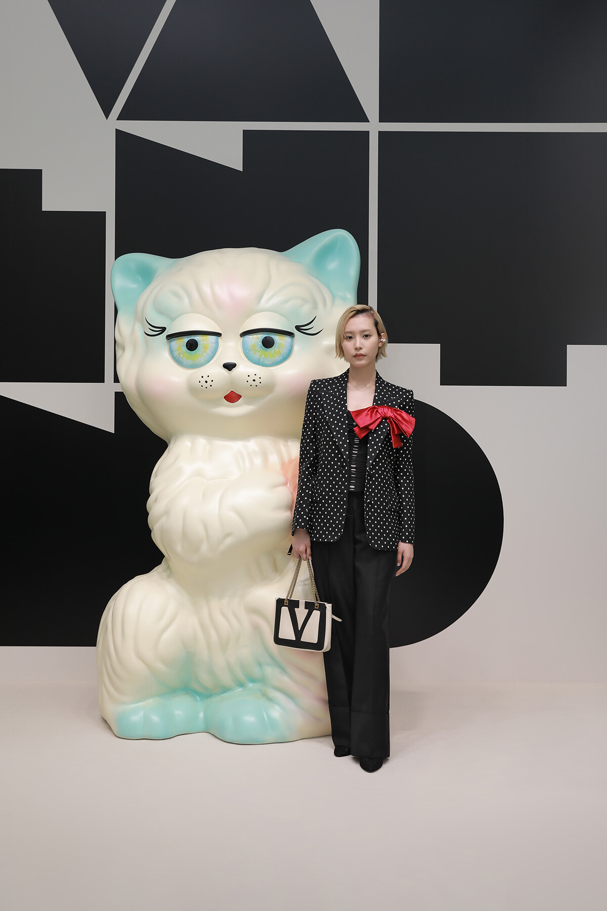 アーティスト、あの。クラシカルでロマンティックなオーガンザドレスに、2025年春夏「パヴィヨン デ フォリ」コレクションに登場した猫型のミノディエールバッグ、ヴァレンティノ ガラヴァーニ「ル シャ デ ラ メゾン」と「ボウワウ」パンプスをスタイリングしている。