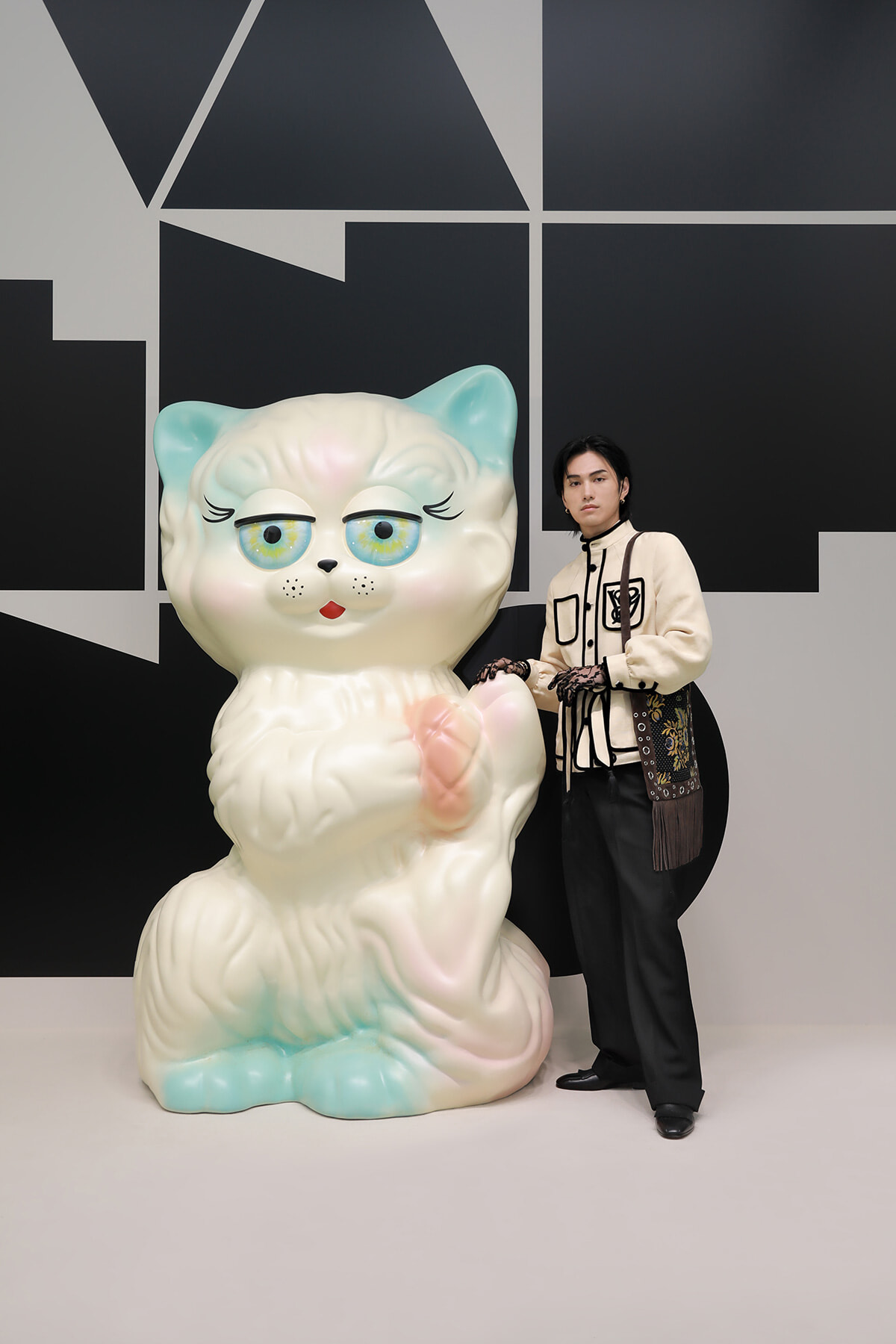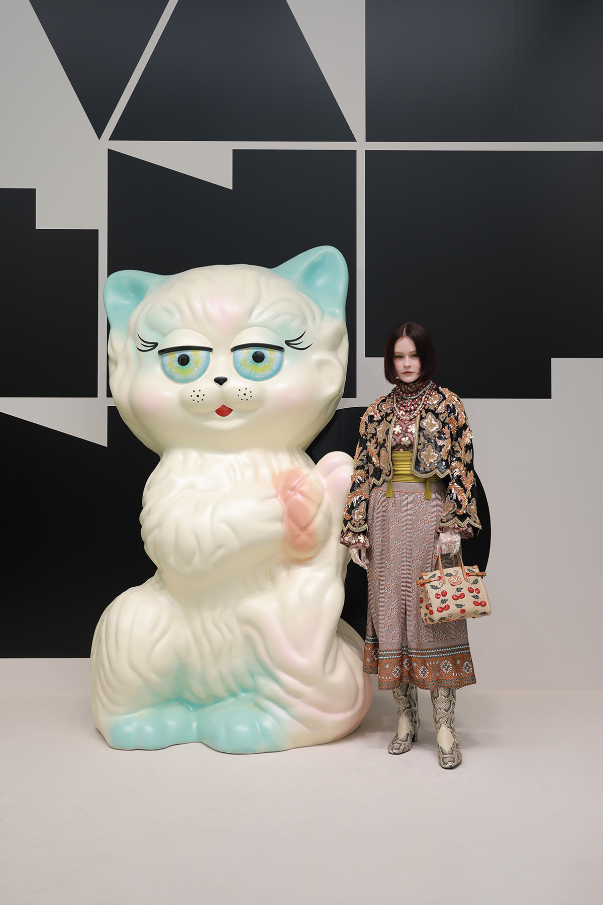 会場入ってすぐのロタンダでは、DJのパフォーマンス。そこを抜けると、2025年春夏「パヴィヨン デ フォリ」のショーに登場した猫型のミノディエールへのオマージュとなるモニュメンタルな3Dインスタレーション、ル シャ デ ラ メゾンがゲストを迎えた。