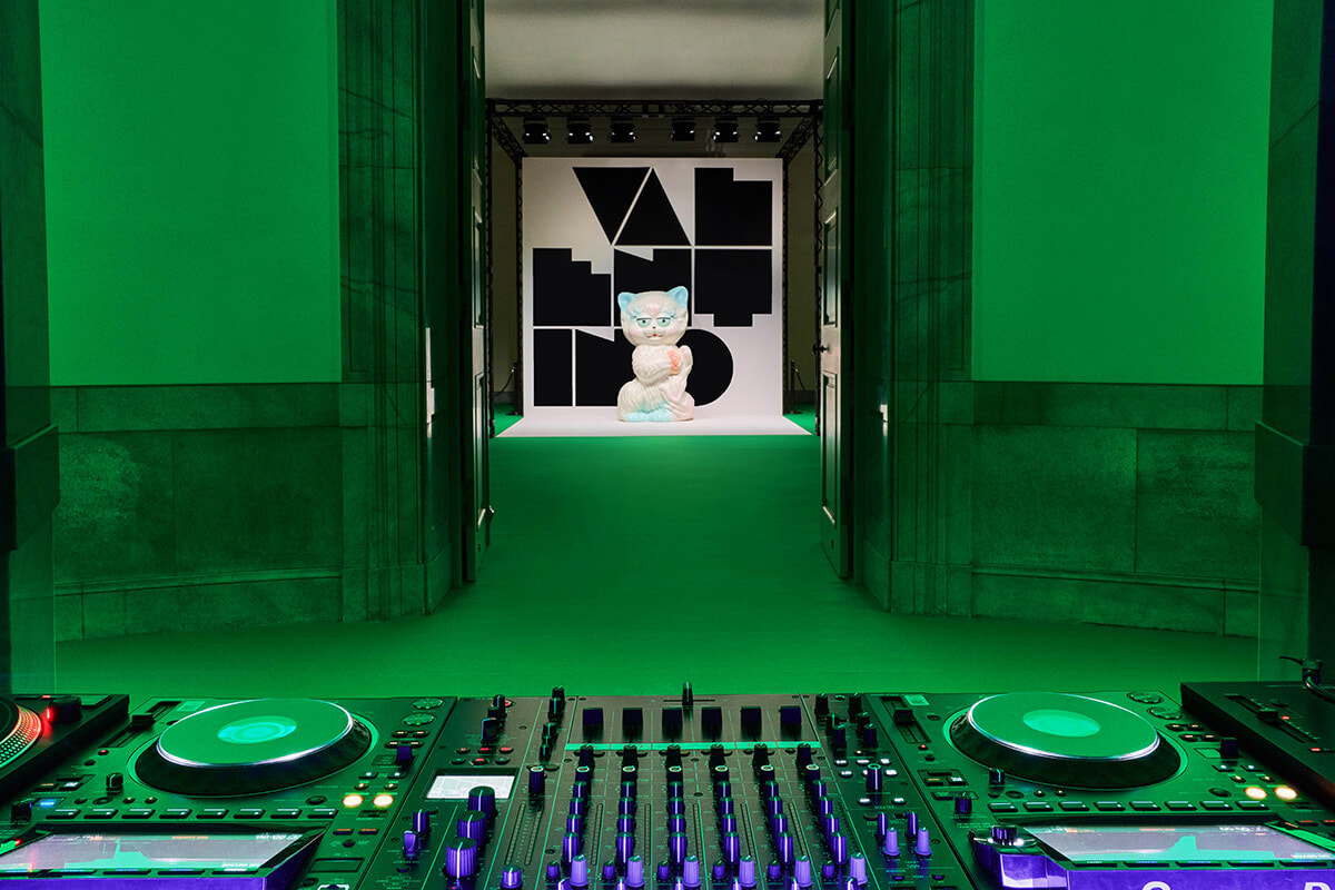 表慶館を一夜限りのパーティー会場へと変えたイベントでは、ゲストたちをファッション、音楽、没入型体験が融合した、発見と遊び、ファンタジーの旅へと誘った。コンセプトは「芸術作品としてのパーティー」。アレッサンドロ・ミケーレの創り出す新生ヴァレンティノの世界観を体験できるように、会場の内装にはとくにこだわりを持ち、各部屋を象徴するカラーパレットやラインティングなどで「パヴィヨン デ フォリ」コレクションとのリンクを持たせた。