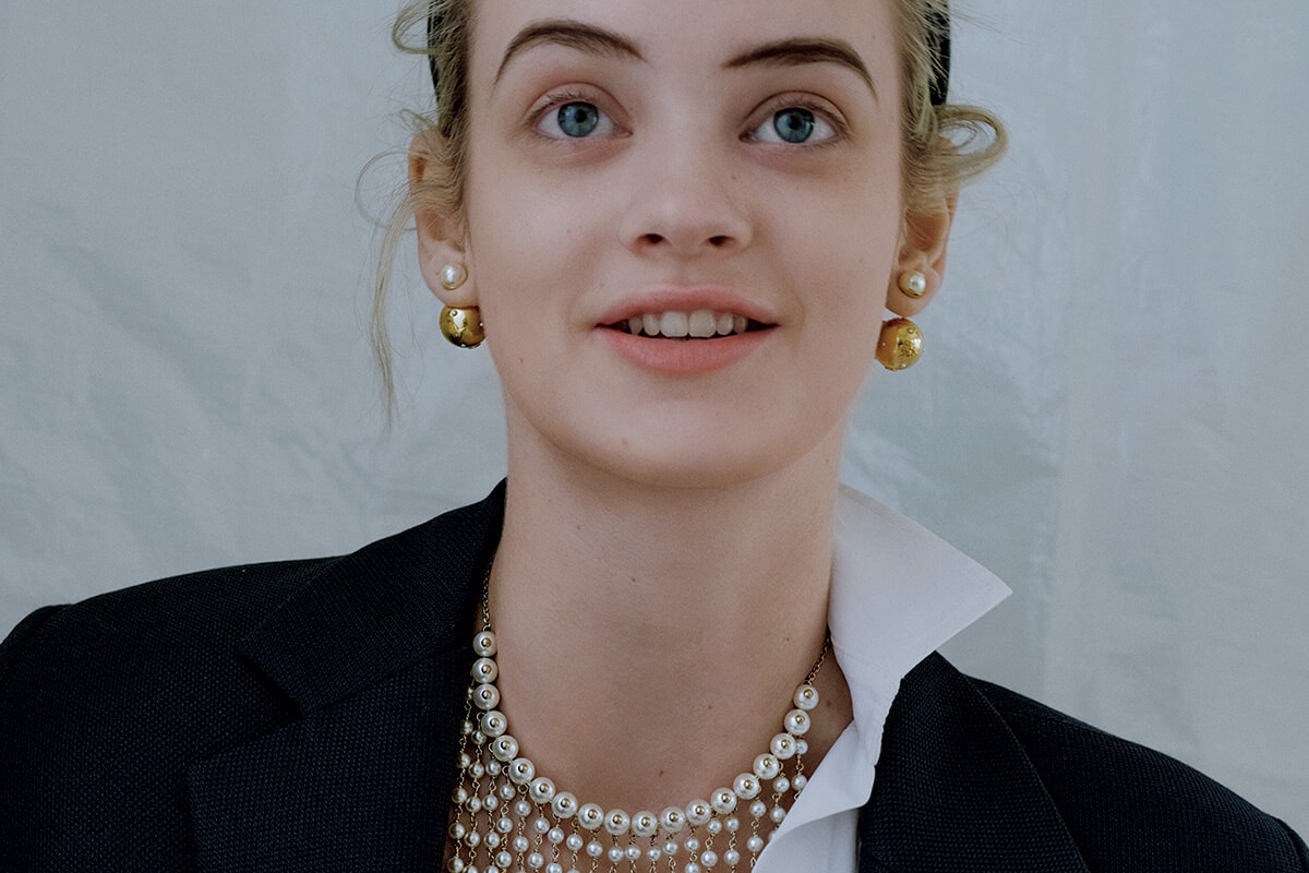 動くたびに揺れるパールをたっぷり用いたチョーカーが、モノクロームのルックに華やぎを添える。>>Read More