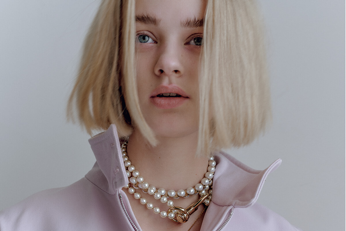 ハーフパールにゴールドをあしらったソリッドなチョーカーと、アイコニックなフックでパールを留めたパンキッシュなネックレスをレイヤード。>>Read More