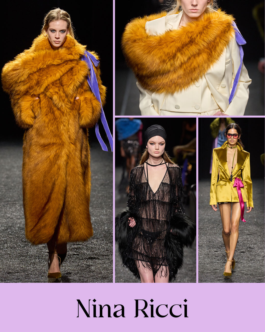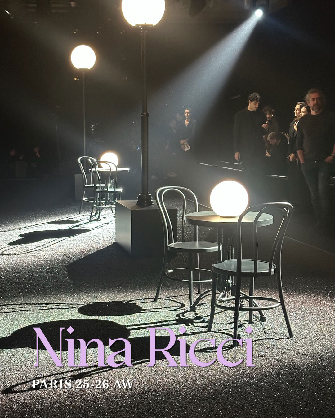昨年来日し、キュートな笑顔で大人気だったデザイナー、ハリス・リードによるニナリッチは秋冬シーズンのせいか??? ぐっと大人っぽいムード。ドットは健在ですが、リボンの使い方もボディに沿うような柔らかなフォルムになるよう作られていて、レースやファーを多用した構成。夜のカフェでランデヴーするような演出でムーディ。