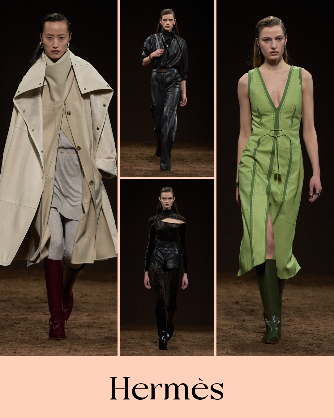 毎回楽しみなエルメスのショーでは、ランウェイの床が土の仕立て。ワンカラーのルックをメインに、真っ赤なブーツを白いルックに投入したり、その演出に女らしい刺激を感じました。