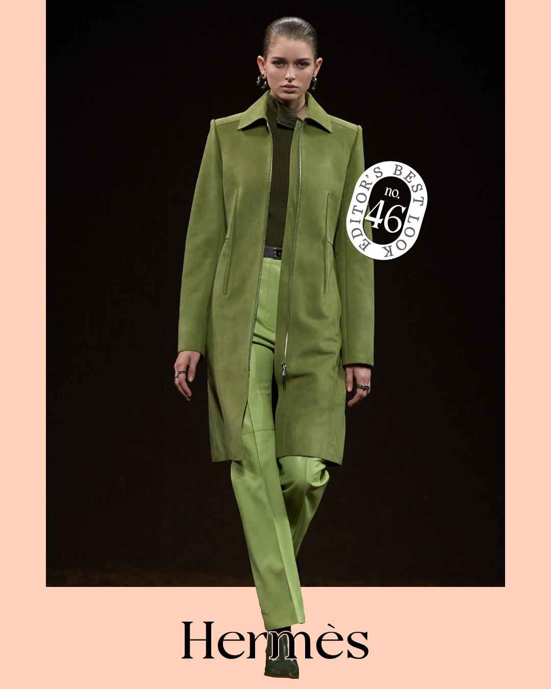 ベストルックは、エルメスのピスタッシュグリーン。これがブラウンやブラックならクワイエットラグジュアリーの極みだけれど、エルメスのレザーの色出しの美学が宿り、そして色彩に非常にこだわるメゾンの哲学もある1着でした。
