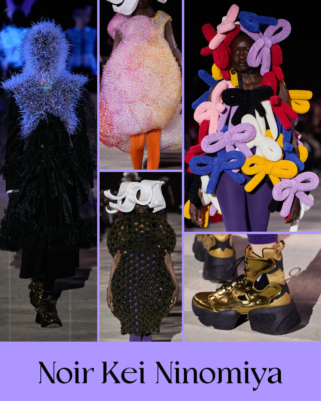 ジバンシィの展示会を挟み、ノワール ケイ ニノミヤのショーへ同じ場所に戻る。ノワール(黒)の世界に放たれた光や輝き。それが色の洪水になって……という流れがロマンティック。リボンやボール状のデコレーション、立体的なビーズなど、過激な装飾はショーの魅力を2割増し。ゴールドのシューズや発砲スチロールで作られた、ニッポンの漫画風なヘアも目が釘付け。