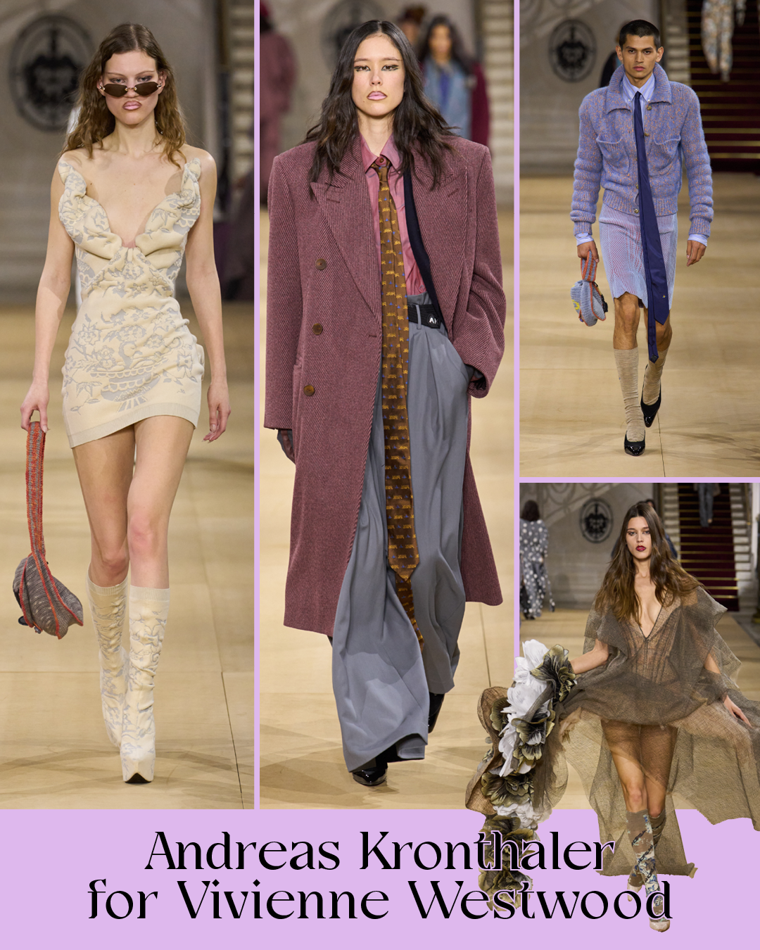 アンドレアス・クロンターラー フォー ヴィヴィアン・ウエストウッドは英国風エッセンスを素材でよりしっかり生かし、シルエットやコーディネートのおもしろさで魅せる。そしてメンズモデルもハイヒールを履いてウォーキング。