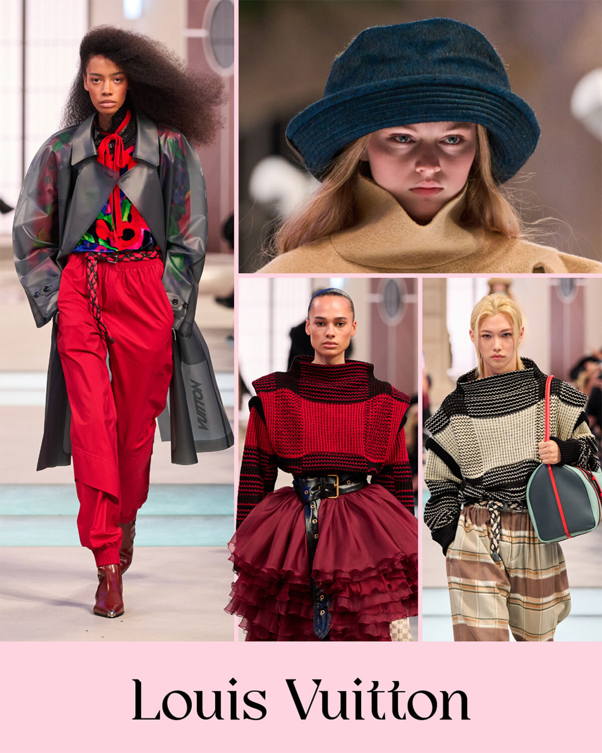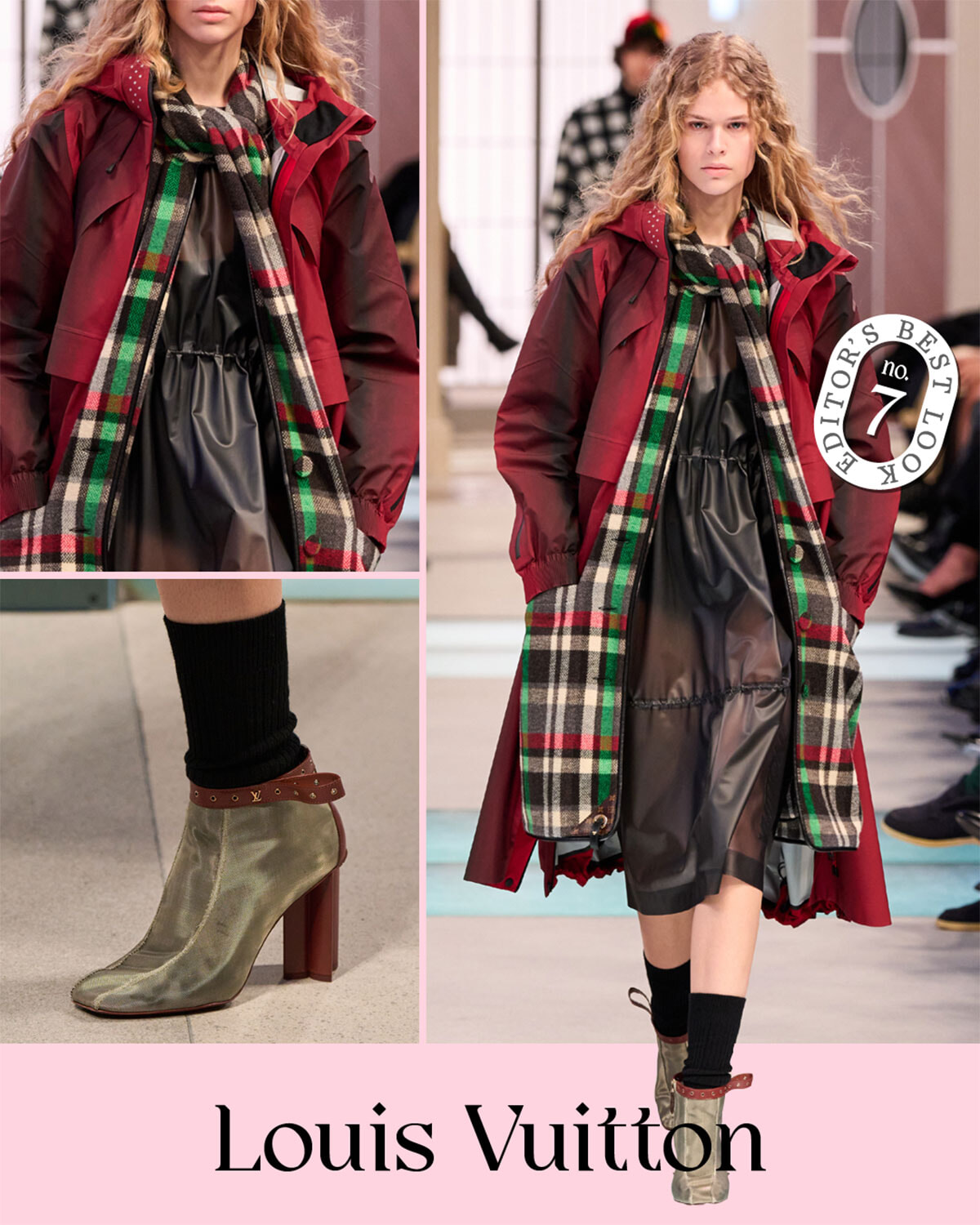 本日のベストルックは、ルイ・ヴィトンのこちら。ヘアの無造作感から足元のショートブーツまで、上質ラブリーの極みです。スポーツからインスパイアされているものの、アノラック以上トレンチ未満なコートもナイス。マフラーのチェックも意外な色選び。