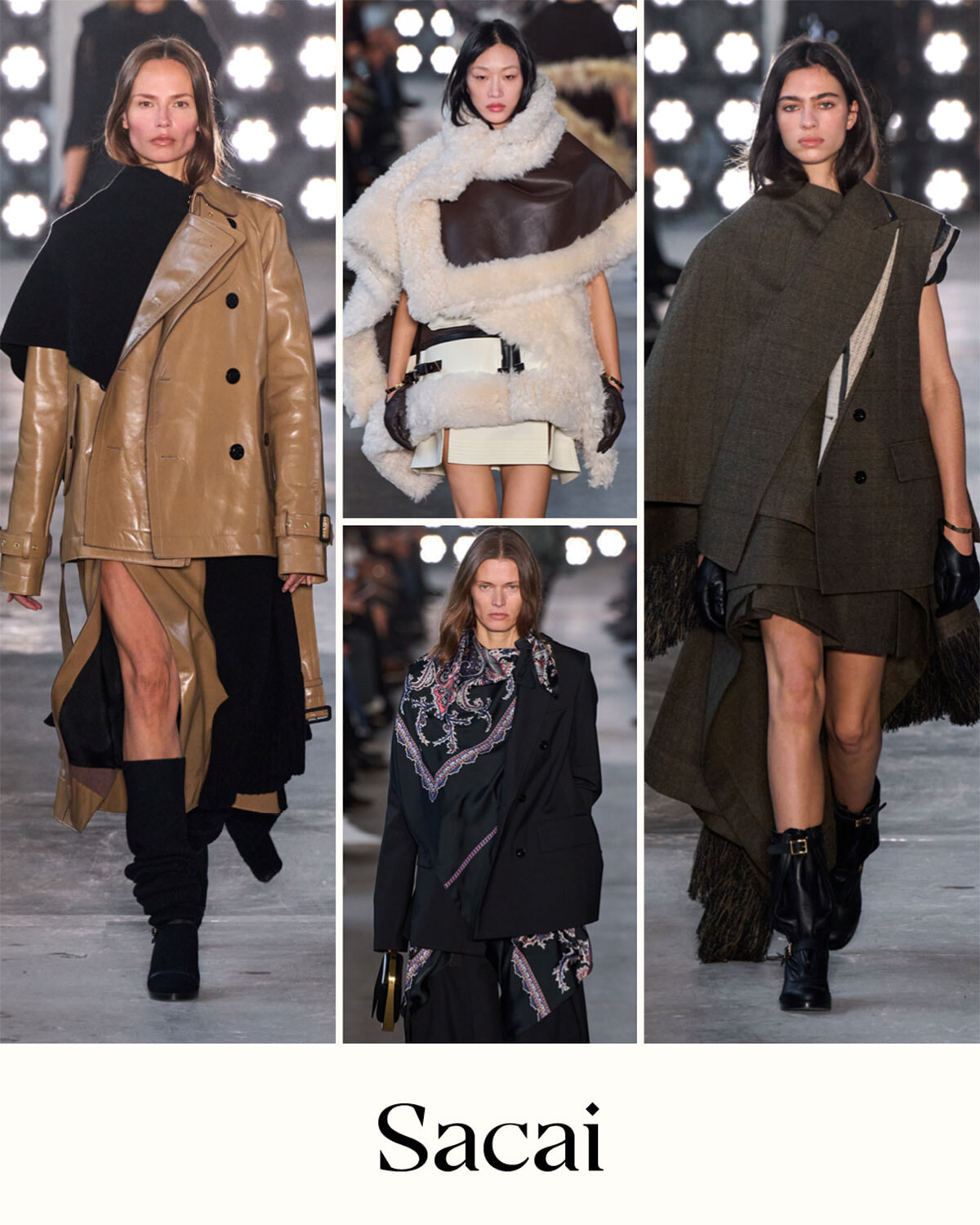 サカイの今季のテーマは「穏やかさ」。でもモデルのウォーキングも服もハンサムでしたねー。身体に巻き付くようにニット、ファー、ウールが躍る中、ジャケットやコートに忍ばせたスカーフが人の動きに合わせて軽やかに舞う様は、新鮮な提案だと感じました。すでに東京で展示会が行われ、ほとんどのスカーフはジャケットの内側に縫い付けられていることがわかりました。秋冬シーズンなのに布の動きの軽やかさを表現するブランドは多く、サカイも同様でしたが、プリントのスカーフで表されると単なるシフォンでの表現よりもリアリティを感じられてよかったです。