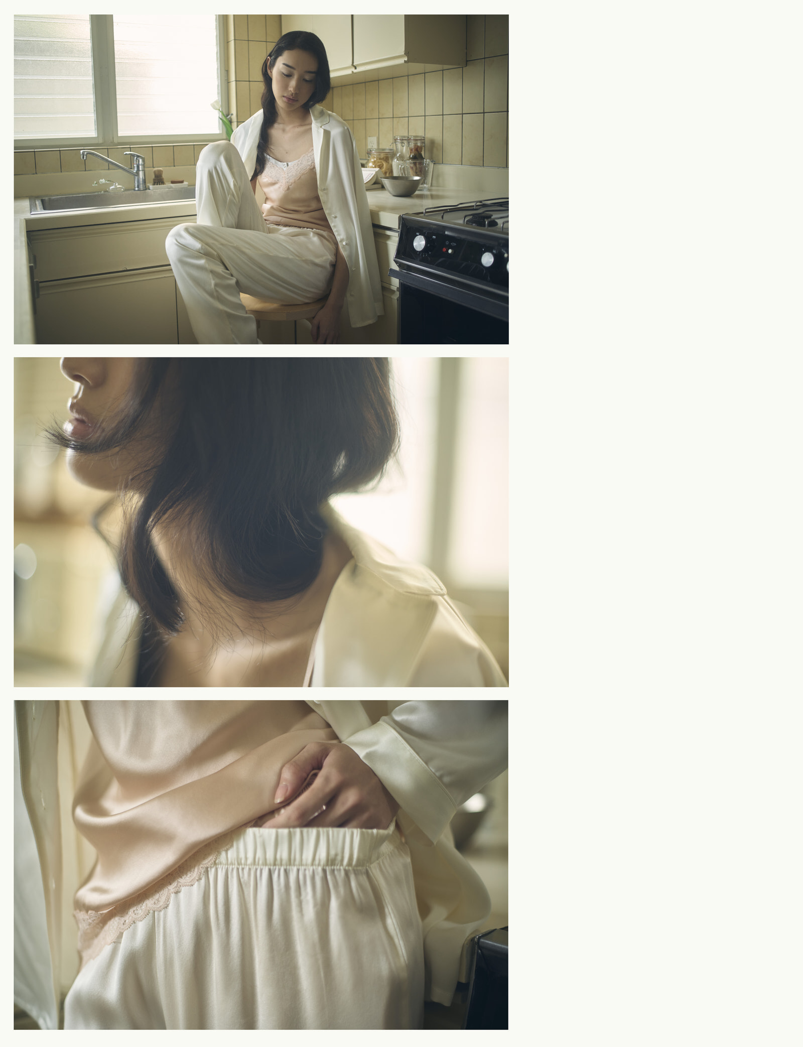シルクのパジャマは肌に寄り添うなめらかさが心地よく、リラックスタイムを格上げする一着。肌寒い朝が続く春は素肌で纏っても気持ちのよいシルクと、柔らかなモダールのキャミソールを重ねてぬくもりをプラス。異なる素材をミックスさせて、大人になっても乙女心を忘れない、二面生のある女性を演出して。