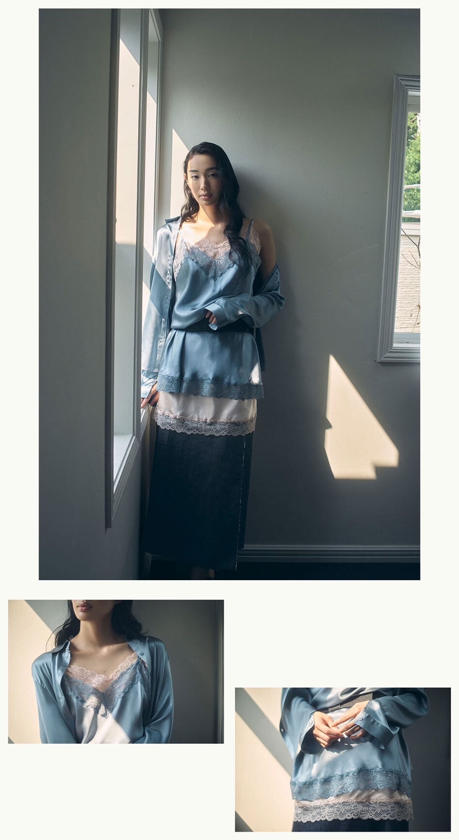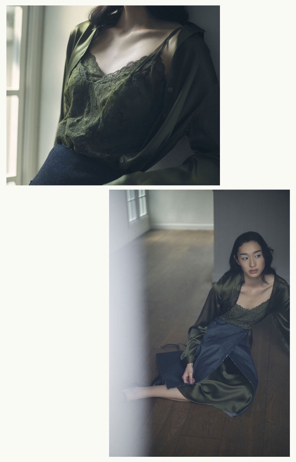 繊細なレースがバスト部分に施されたバンブーグリーンのスリップドレスは、シルクの光沢が美しく映えるシックな一枚。センシュアルなランジェリーとしてはもちろん、同色のシルクのトップを下に重ねてドレスライクに着用するのも◎。相反するようなテクスチャーのデニムを合わせることで美しいドレープやギャザーが生まれ、シルクの質感が一層際立つ都会的なスタイリングに。
