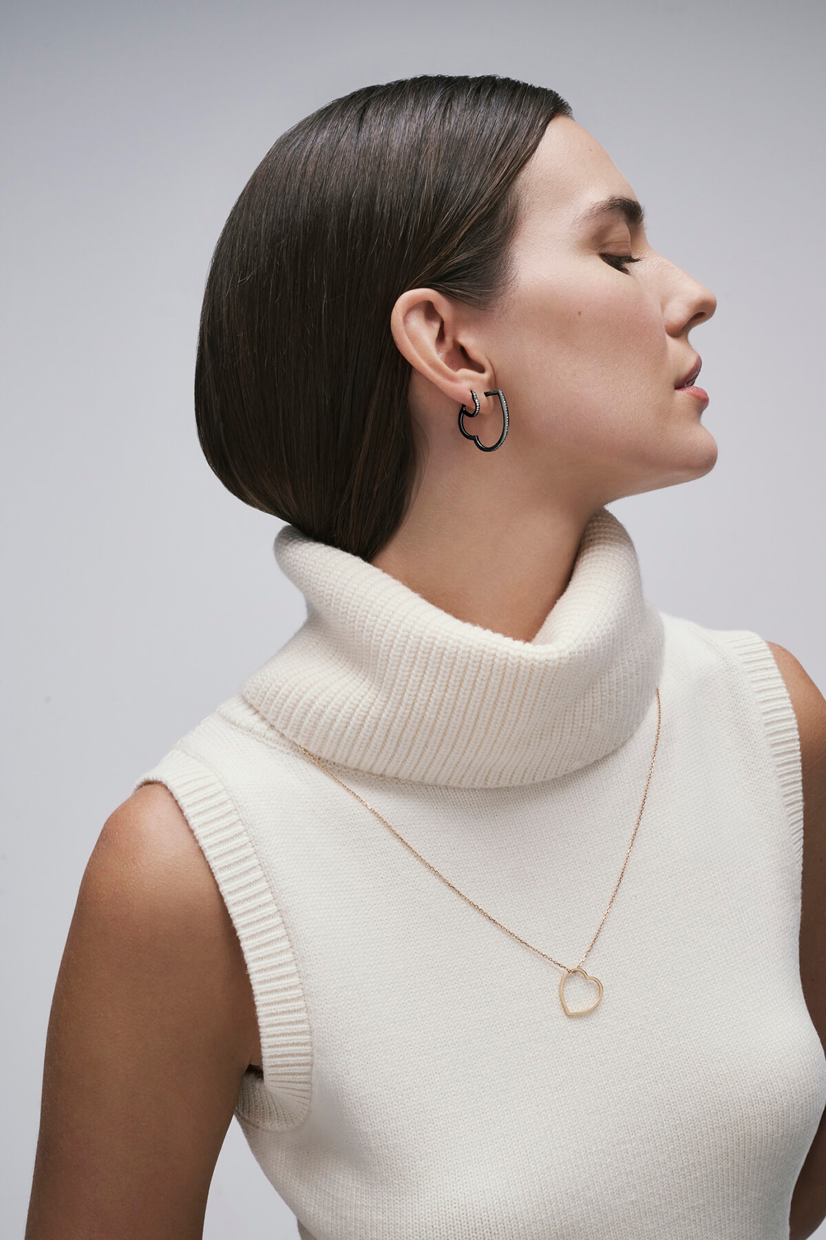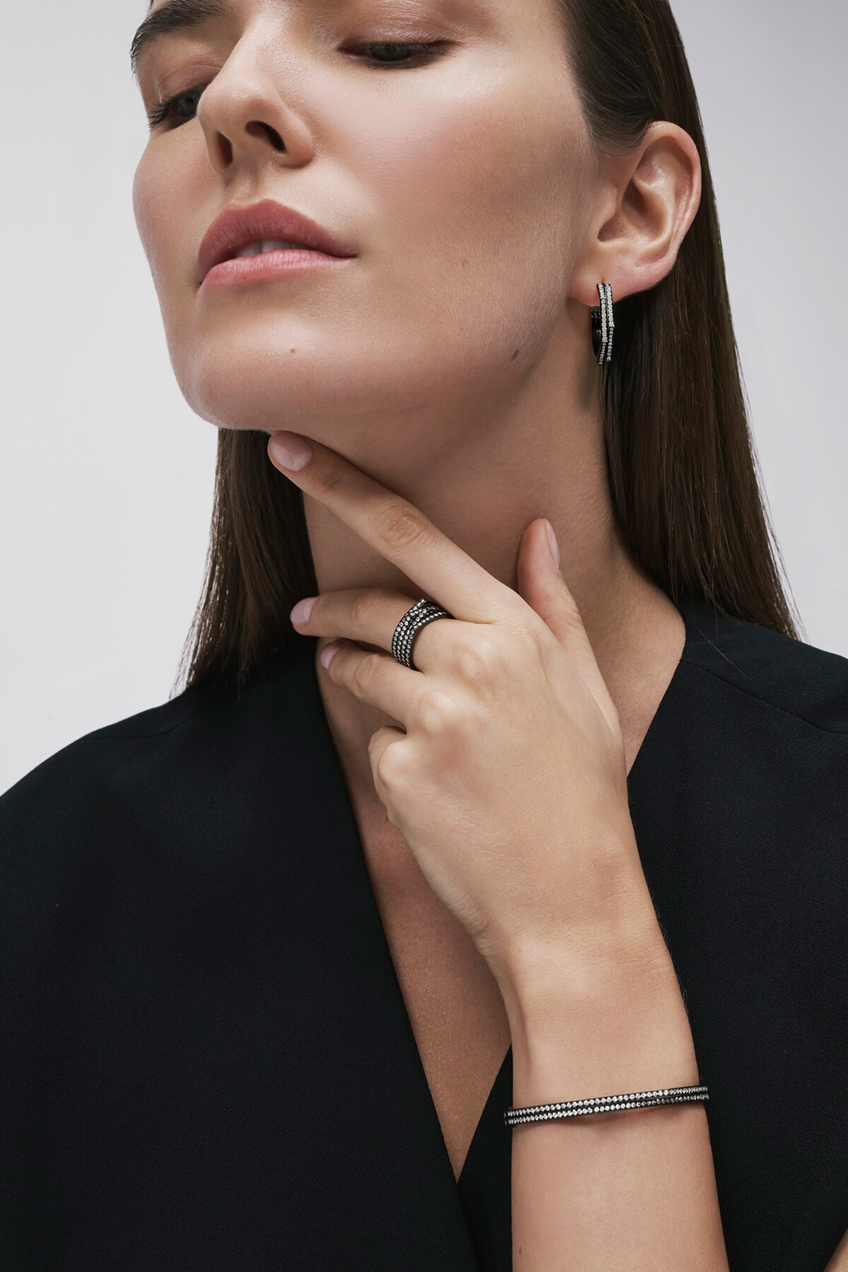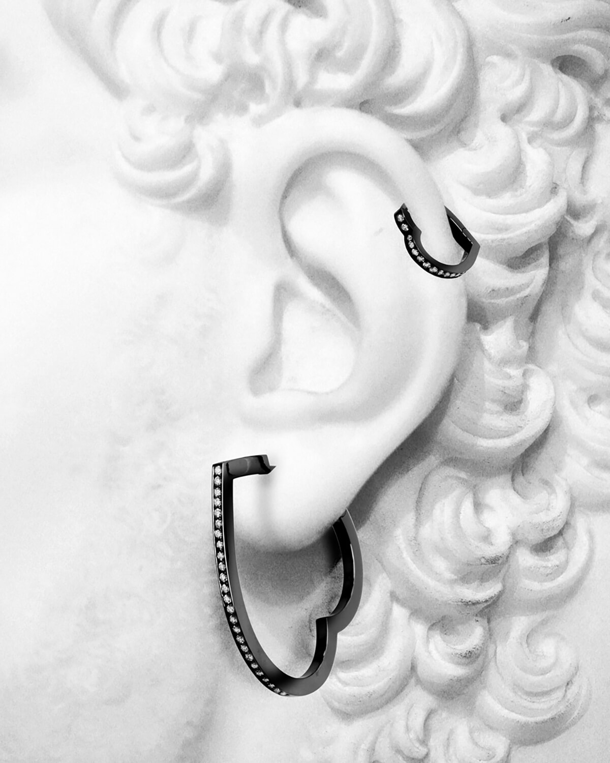「アンティフェール」コレクションのブラックゴールドのアイテムは、パンクロックカルチャーとパリ・ヴァンドーム広場の名だたるジュエラーの一員でもあるレポシの時代を超える精神との出合いとして、レポシのアバンギャルドなビジョンを表すもの。メゾンのシグネチャーでもあるこの鮮烈なブラックゴールドは、イタリアにあるごくわずかな工房の職人だけが熟知した独自のルテニウムコーティングプロセスによって実現される。深みのあるブラックゴールドと高純度のダイヤモンドが強いコントラストを成し輝く様子は唯一無二の美しさ。