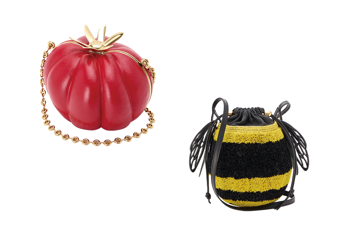 ハチやトマトなどキュートなモチーフやカラフルな夏のマストハブが揃う。左から「トマトクラッチ」(H9.5×W14×D12.5cm)¥541,200、「ビー バスケット」(H17×W16×D16cm)¥218,900(すべて予定価格)/以上ロエベ(ロエベ ジャパン クライアントサービス)