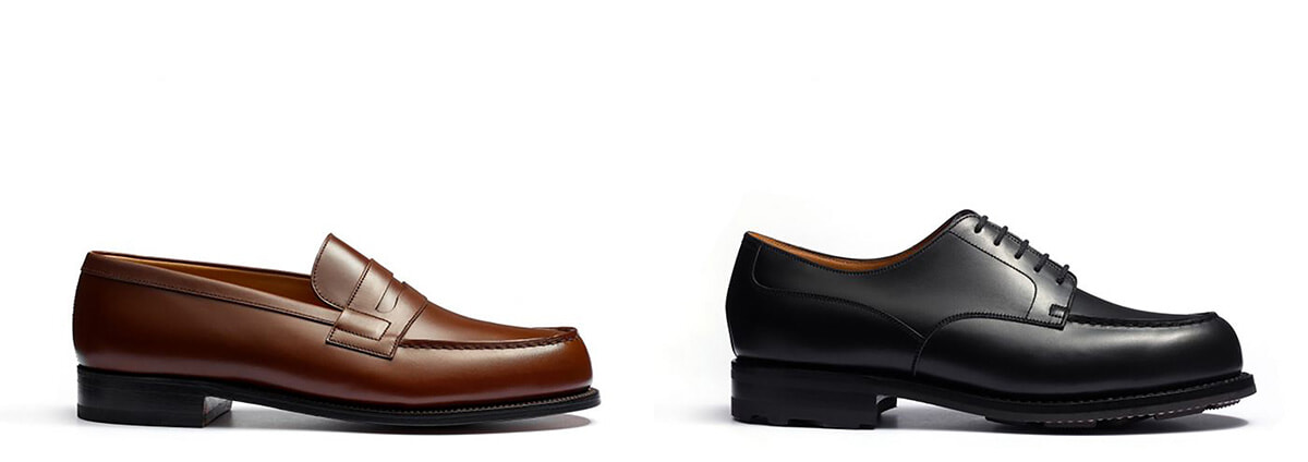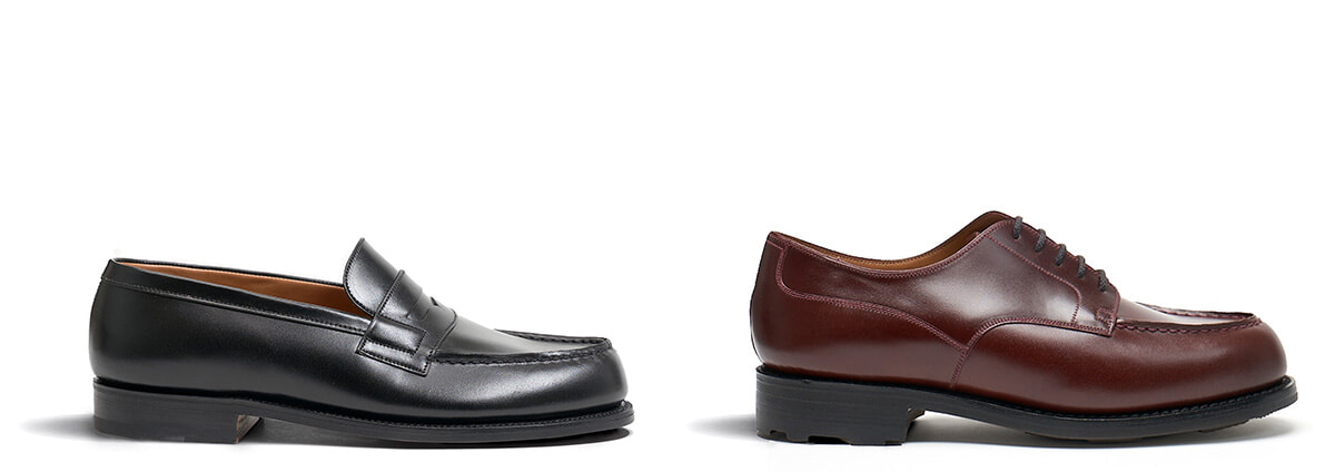 希少なため幻のレザーと言われるロシアンカーフ。ジェイエムウエストンのロシアンフィニッシュカーフは、その伝統的なカーフをイメージしてなめした特別なレザーを使用したモデル。左:シューズ「シグニチャーローファー #180」タンブラウン¥187,000 右:シューズ「ゴルフ #641」ブラック¥209,000/ともにジェイエムウエストン *メンズ向け展開予定。