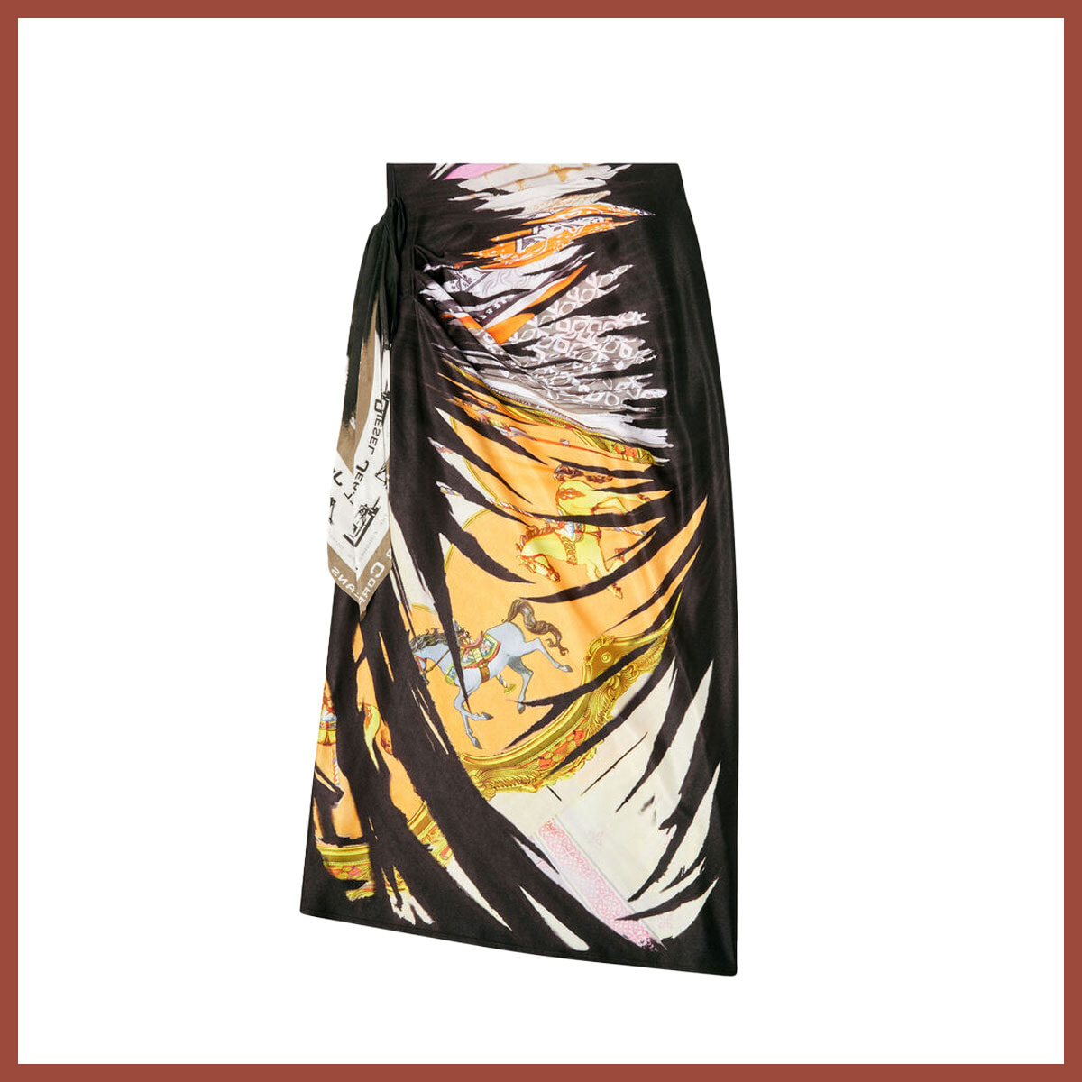 アーカイブのバンダナ柄を再構築。すり減った黒のペイントからトラディショナルな回転木馬のプリントが覗く、遊び心満載な一着。
