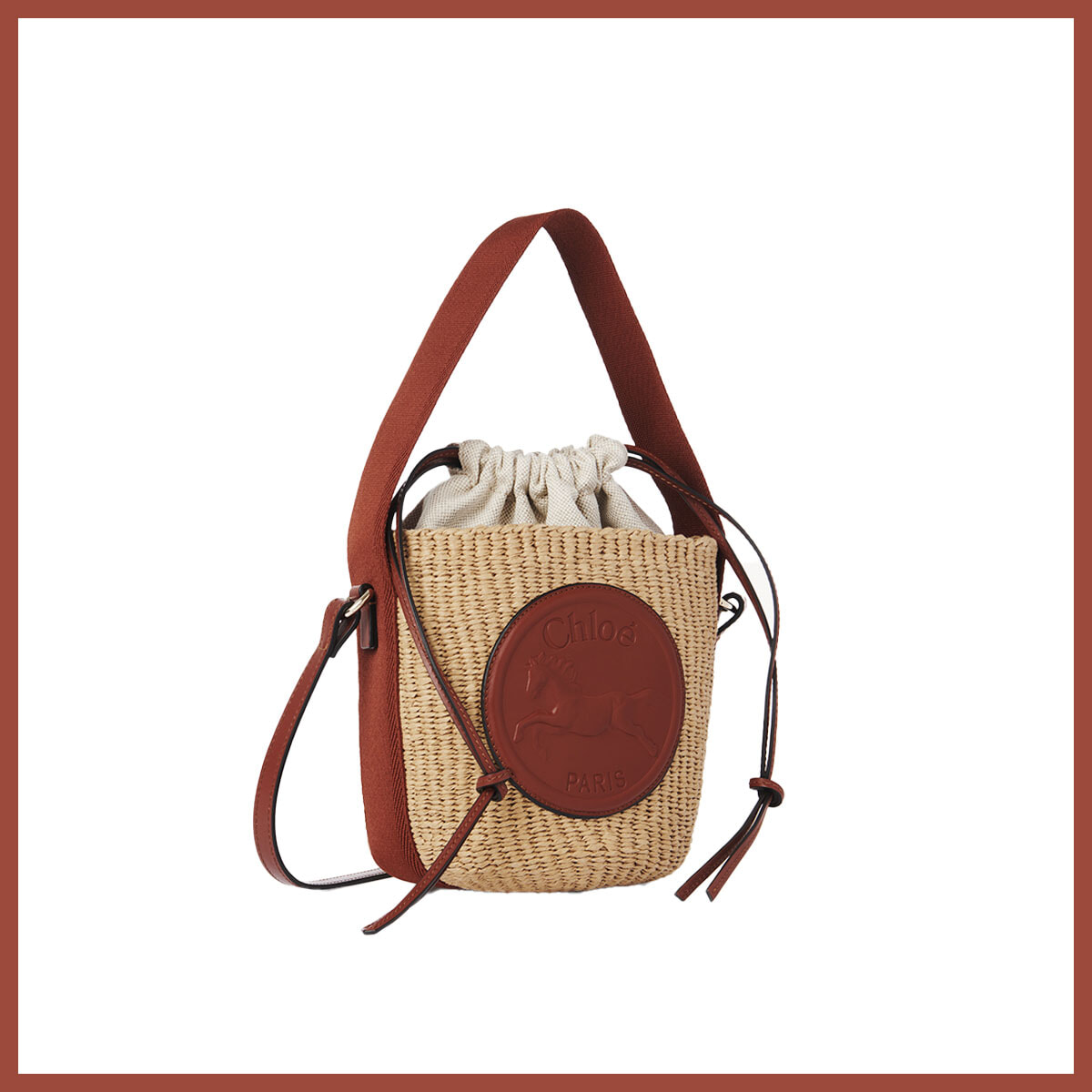 ケニアの女性職人が手編みで仕上げたバスケット。「ホース メダル」がフロントにあしらわれ、丸みを帯びた愛らしいフォルム。
