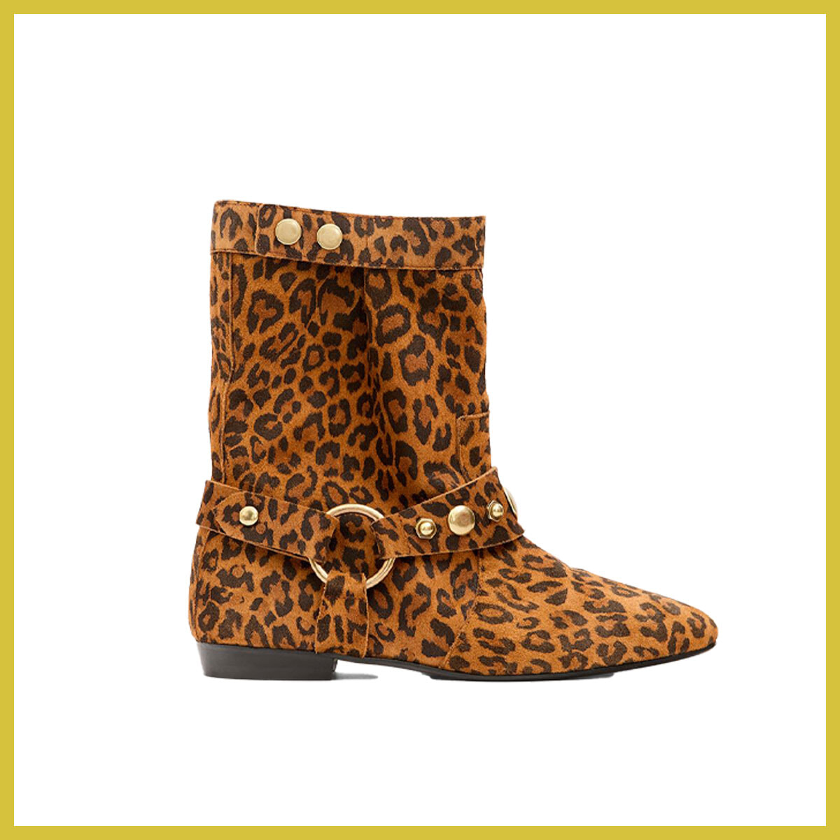 ブランドのアイコニックなシェイプにレオパードモチーフをプリント。柔らかなレザーで履き心地のいいブーツはスタイリングのポイントに。
