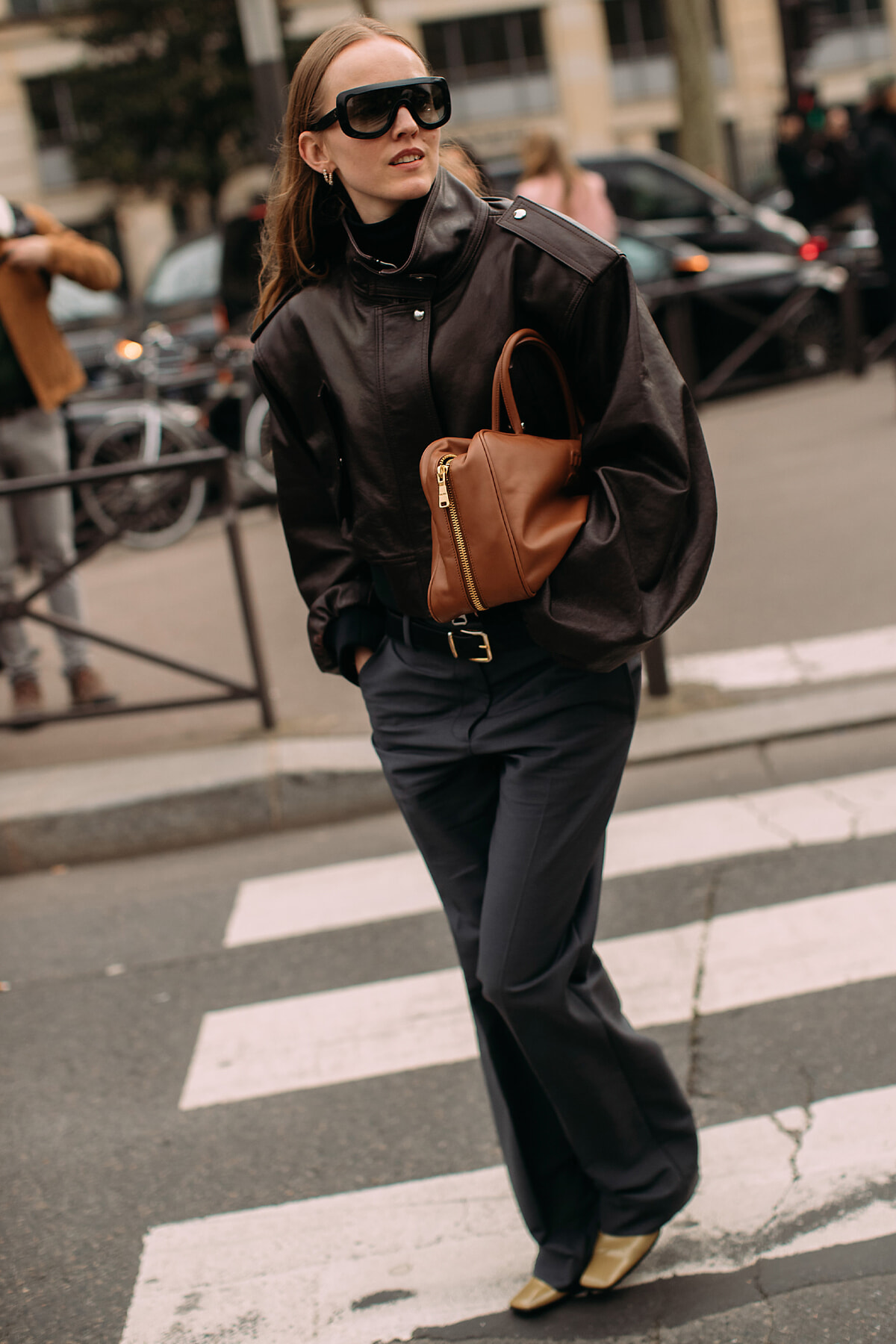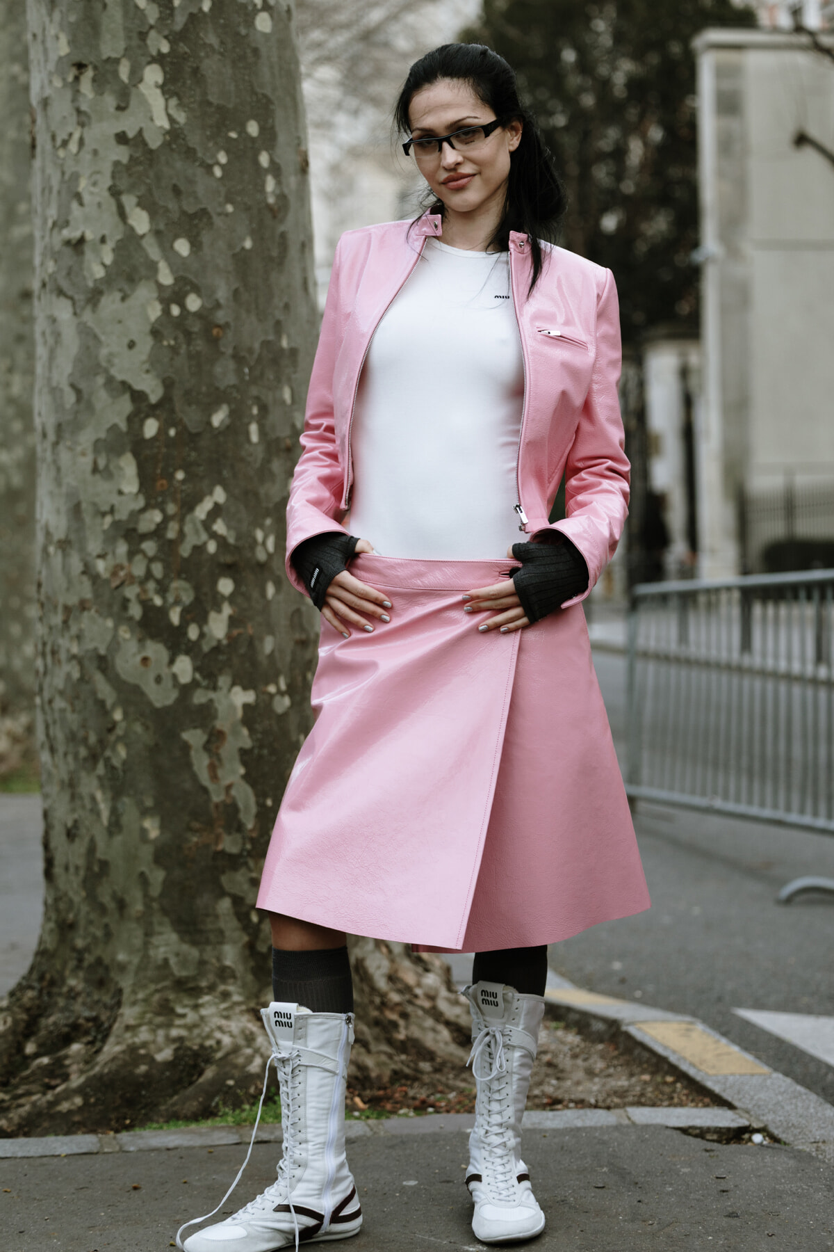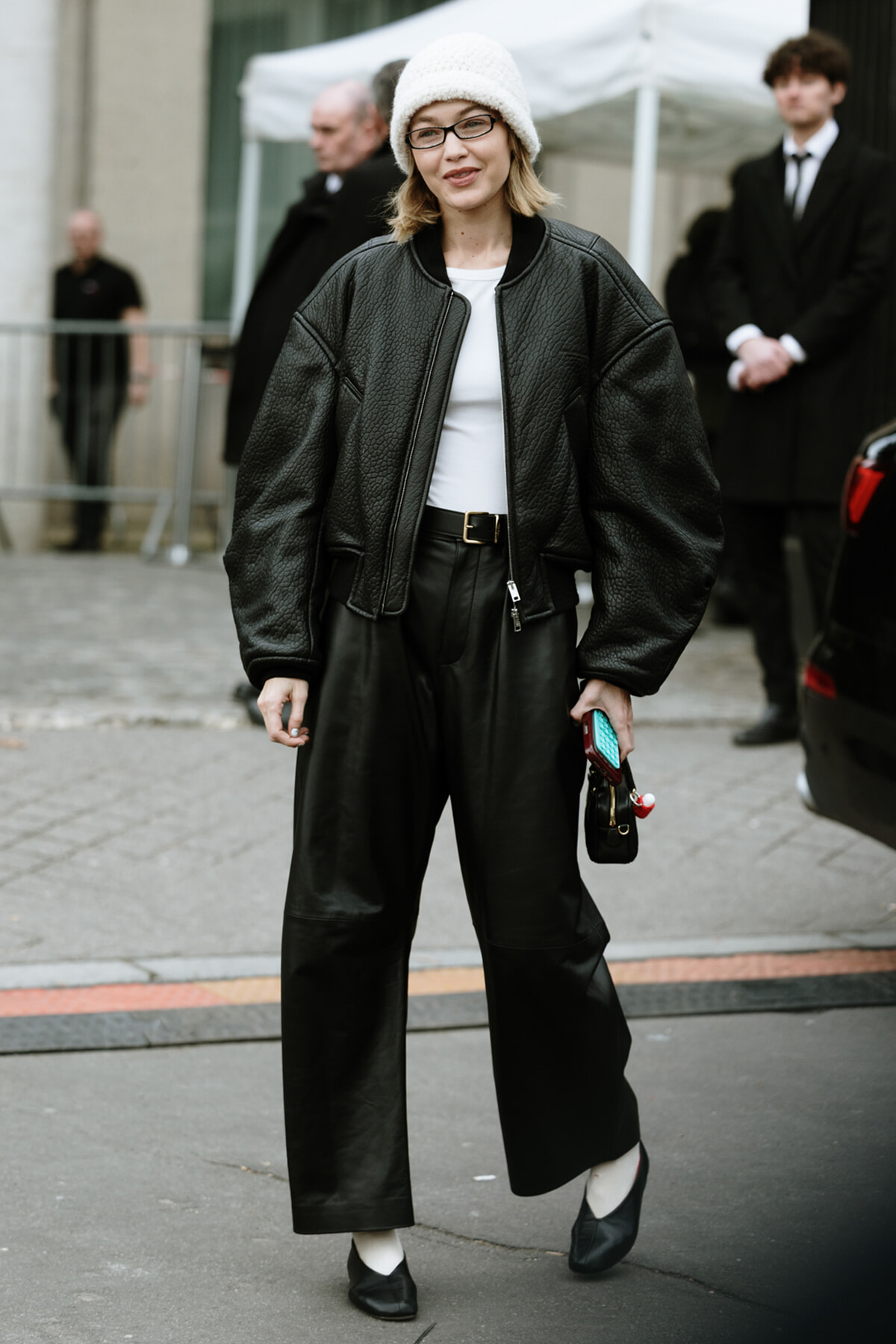 ミュウミュウのショー会場付近でキャッチされた、最近婚約報道で話題のジジ・ハディッド。レザーのジャケット+パンツをモノトーンでまとめていてハードになりそうなところを、ビーニーとメガネでギークな方向にもっていっている。白ソックスの合わせも不思議な感じ。