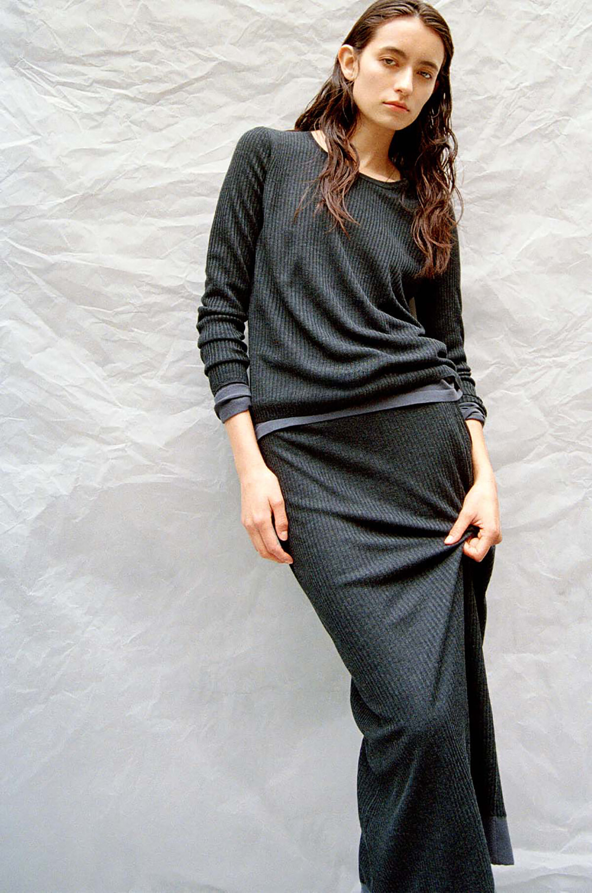上品で華奢な素材選びにこだわった「シアーニット」シリーズ。薄手で華奢な光沢糸の入ったシアー感のあるリブ編みとフラットな天竺編みを重ねている。プルオーバーはレイヤードを楽しめるよう、袖と裾は表面と内側をセパレートした仕様になっている。女性らしさのあるタイトなアイラインシルエットのリブニットスカートと合わせれば、大人のリラックス感漂うスタイルに。プルオーバー¥13,000、スカート¥13,000(ともに5/23発売)/ともにプラステtext: Natsuko Kadokura