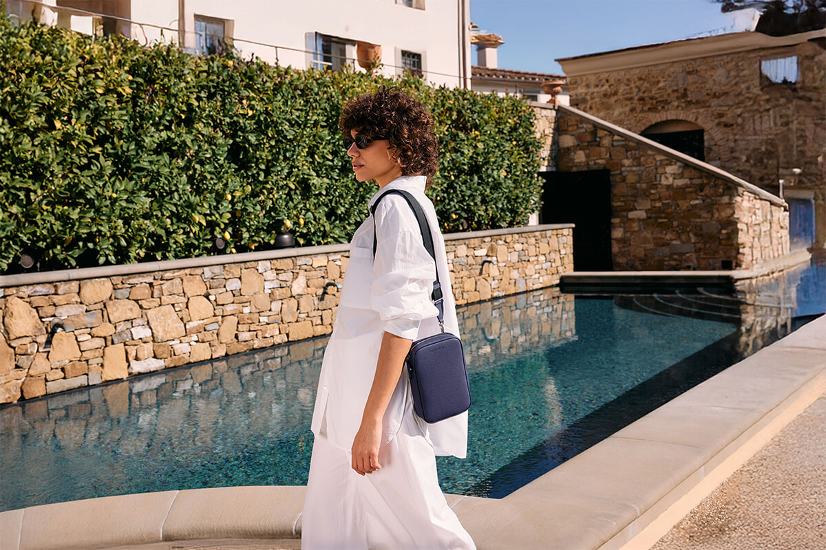 今回のコレクションのテーマは「Fuga al Mare(フーガ アル マーレ)=海への気ままな旅」。太陽にきらめく地中海の海を思わせるアトールブルーと、静けさと上品さをたたえたインディゴブルー。洗練されたふたつのブルーが、夏の休暇のワンシーンを連想させる。
