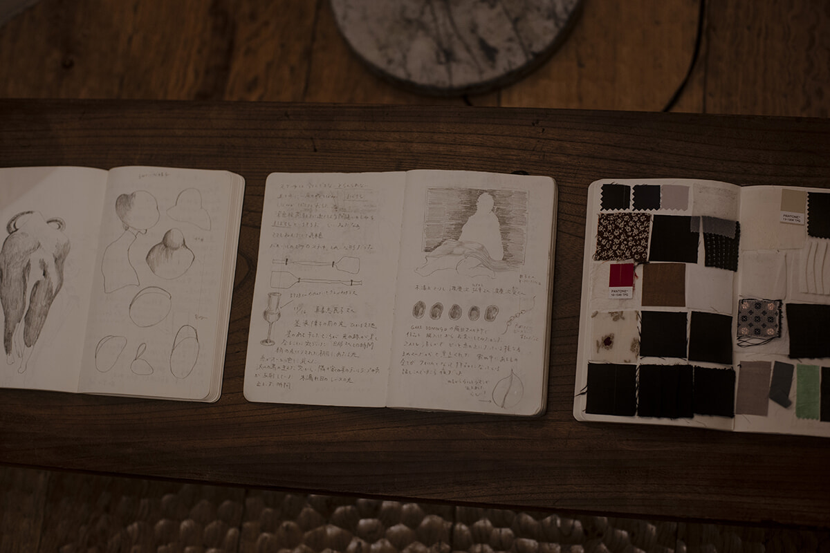 「かたち」というもっともシンプルな物質的要素へと目を向け、日常にあふれる事物の多様なフォルムにインスピレーションを受けた今シーズンのコレクション。制作の出発点となった書籍やダイアリーの抜粋をはじめ、塗り潰されたポラロイド写真や小石などのファウンドオブジェクトなどが展示され、同空間に共存する今季の服と接続されることで、長きにわたるコレクション制作の旅路を追体験することができる。これにより、実際に完成された服を目にし、袖を通した時の感動や愛着はひとしおだろう。