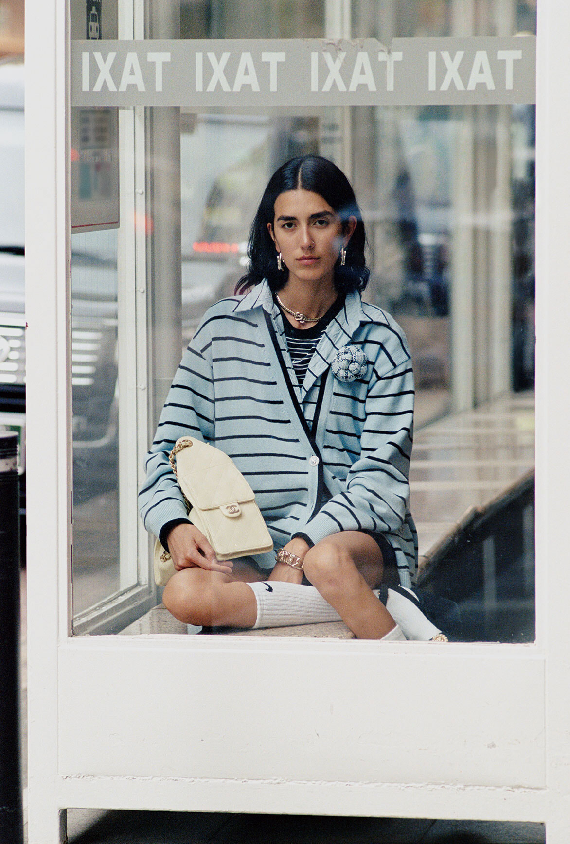 カーディガン¥772,200、ブラウス¥664,400、イヤリング¥150,700、ネックレス¥114,400、ブローチ¥147,400、ブレスレット¥212,300、バッグ¥982,300、サンダル¥514,800/以上シャネル(シャネル カスタマーケア) 中に着たボーダーTシャツ¥5,830、ウエストゴムのショートパンツ¥6,380、リブハイソックス¥1,980/以上ナイキ スポーツウェア(ナイキ カスタマーサービス)