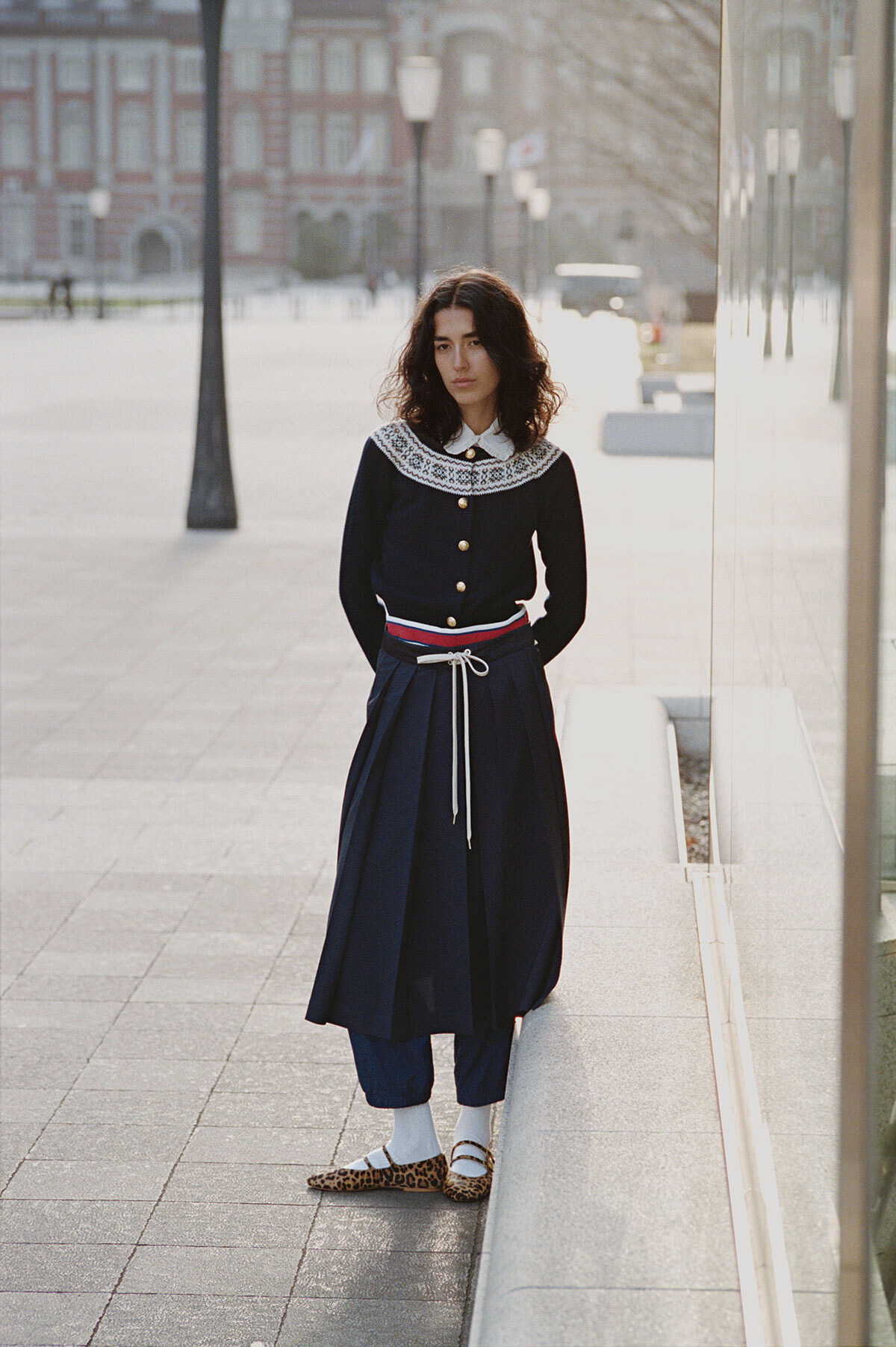 カーディガン¥264,000、中に着たブラウス¥225,500、シューズ¥154,000(すべて予定価格)/以上セリーヌ バイ エディ・スリマン(セリーヌ ジャパン) スカート¥169,400/モンクレール(モンクレール ジャパン) 下に重ねたパンツ¥14,080/チャンピオン(ヘインズブランズ ジャパン カスタマ ーセンター) ソックス¥1,980/ナイキ スポーツウエア(ナイキ カスタ マーサービス)