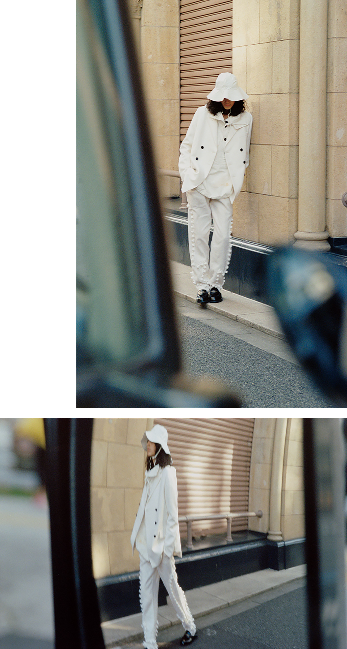 クリーンなイメージのオールホワイトはヴィンテージをミックスしてラフに着崩すのがパリジェンヌ流。バージンウールを使用した仕立ての良いオーバーサイズのブレザーで洗練された印象をプラス。ミュールタイプのローファーやハットも好アクセント。