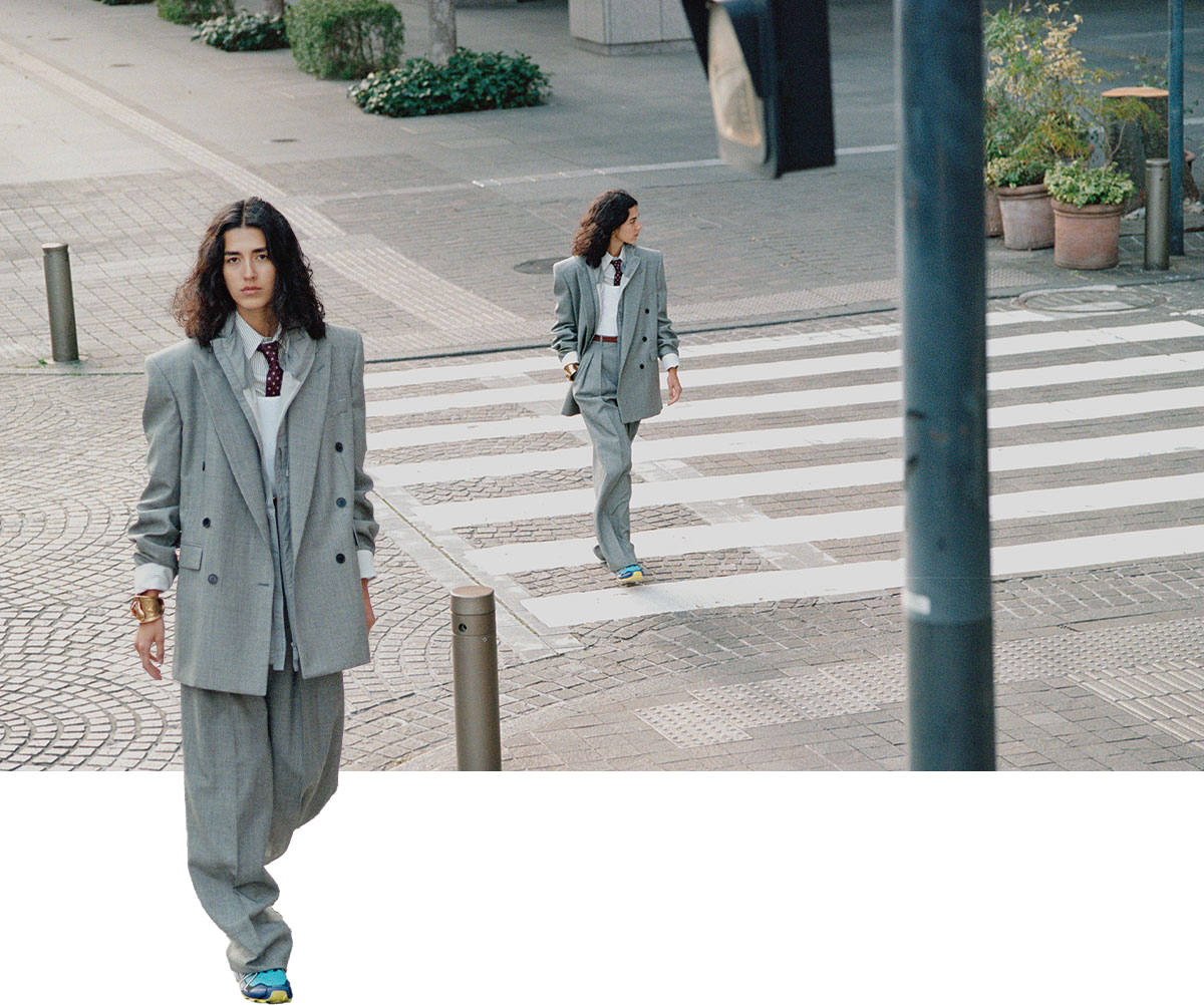 エレガンスを象徴するダブルブレストジャケットのセットアップ。ジャケットのインナーに同色系のウィンドブレーカーを仕込み、ネクタイはタンクトップにイン。さらに足元にはカラフルなスニーカーを合わせて。絶妙なレイヤードのバランスで、シックなセットアップもデイリーに着こなすことができる。