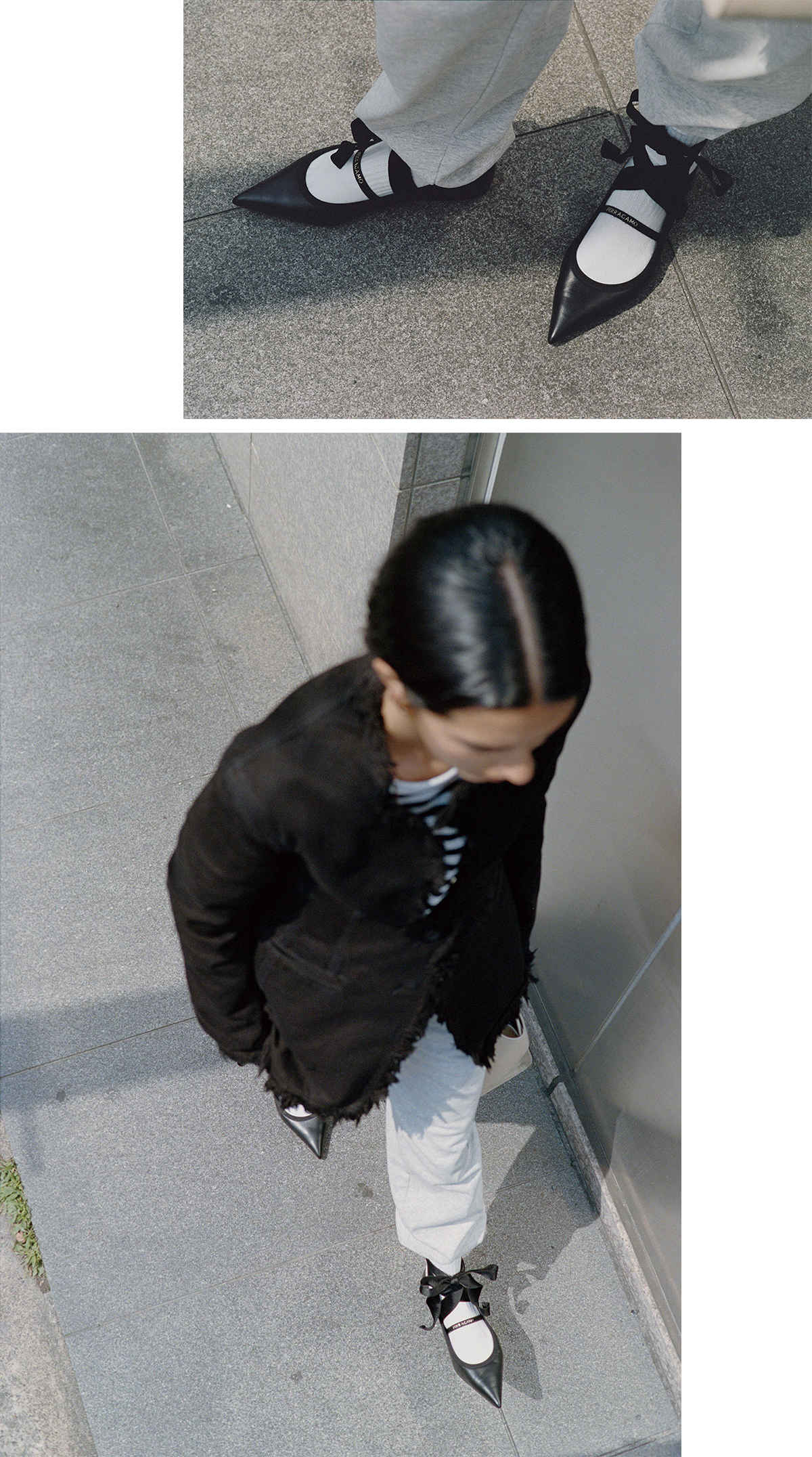フレイドヘムのカッティングがドラマティックな曲線を描くデニムジャケットに、ボーダーとスウェットパンツを合わせてラフに。スウェットパンツの裾の上にソックスを伸ばし重ねて、バレエシューズのシルクリボンを編み上げれば、スタイリングにひねりが生まれる。表情豊かな足元で軽やかなステップを!