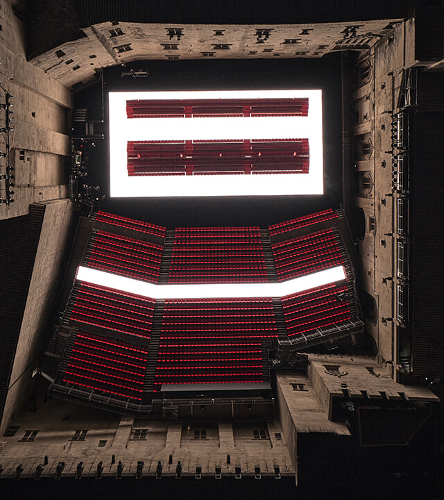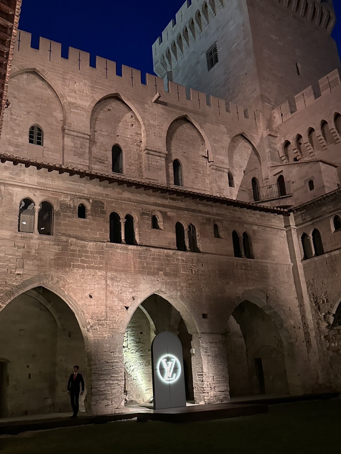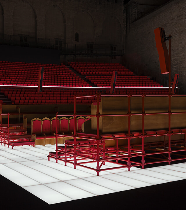 中世、ローマ教皇が住居にしていたゴシック様式の宮殿で、4基の塔を備え、高さ50mの外壁で囲まれている。大広間、礼拝堂、教皇の私室などが一般公開されており、今回ランウェイが設置されたのはクール・ドノール(前庭)。毎年7月に開催されるアヴィニョン演劇祭で舞台芸術が披露される場だが、ファッションショーに使用されるのは初めてだという。今回は出演者と観客の位置を反転させ、ステージ上に赤いベルベットで覆われた木の椅子が用意され、ランウェイが本来の客席にまで続いた。
