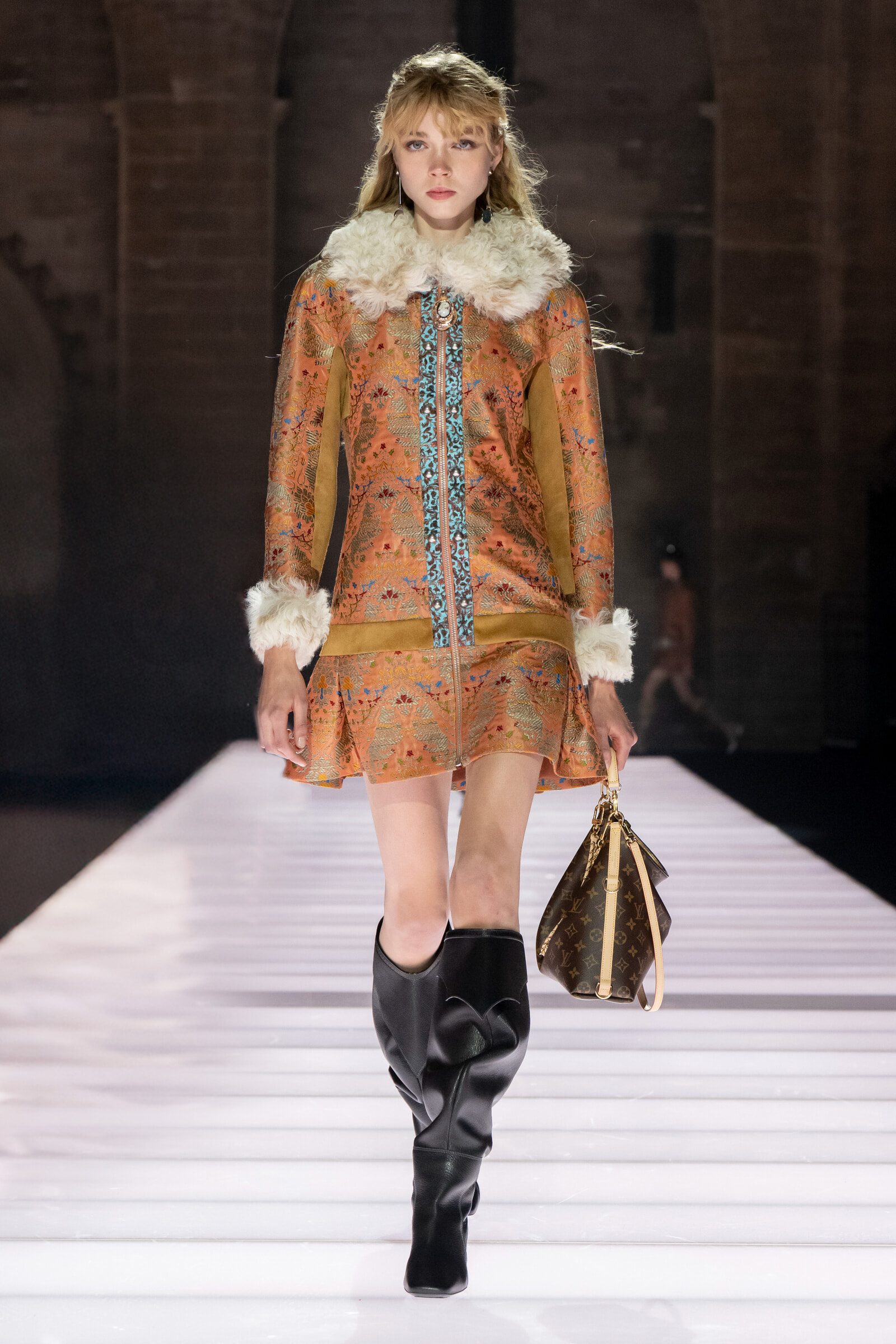 冒頭はミニスカートやAラインが続き、1960年代の薫りもしてくる。美しい柄の織りや刺繍、手の込んだレザーの細工も目を引いた。
