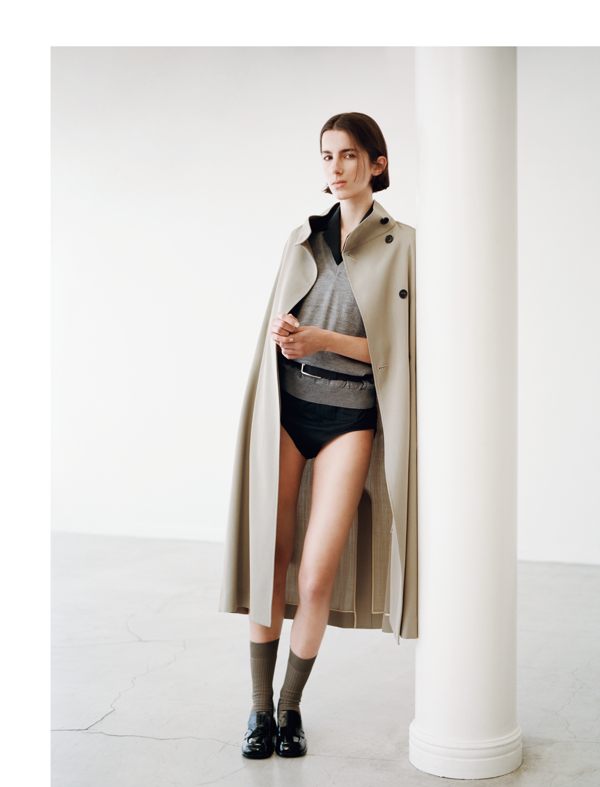 トレンチコートは抑揚のあるスタイリングでいまの気分を投影させたい。ラフに肩に掛けてノンシャランを演出する着方に、パリシックなセンスが宿る。