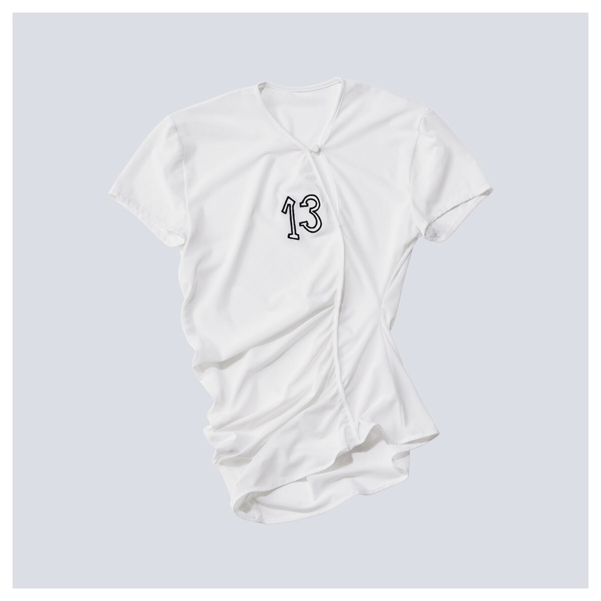スウェーデン、ストックホルム発のブランドによる、あえて不吉な数字をナンバリング刺繍で入れたチュールTシャツ。