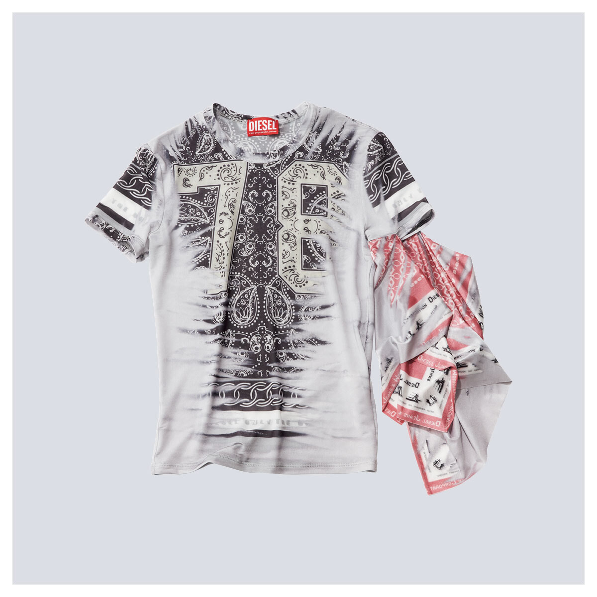 バンダナ柄をプリントしたナンバリングTシャツ。左袖のスカーフは、そのまま垂らしても左腕に巻き付けても。