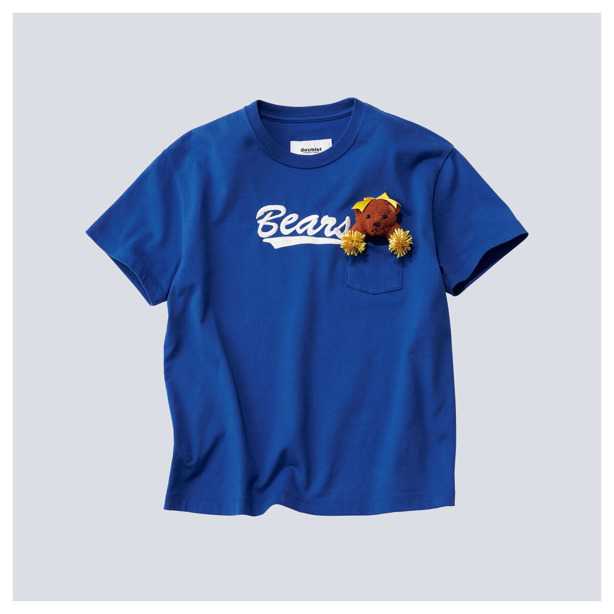 チアリーダーのクマのぬいぐるみが胸ポケットから覗くファニーなTシャツ。”Bears”の刺繍ロゴもいい。