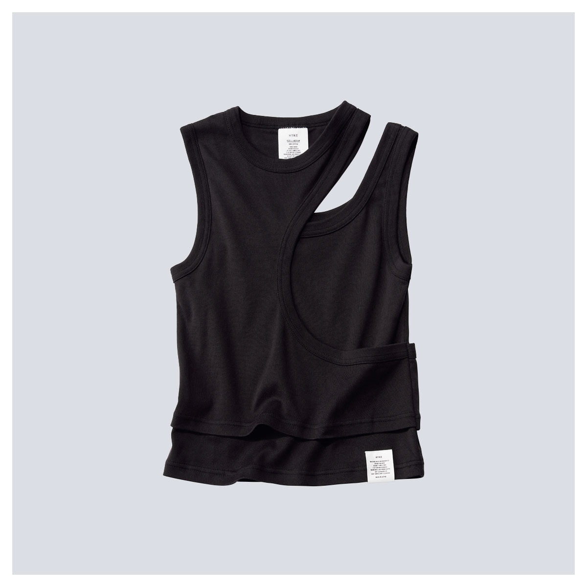 クルーネックのリブタンクトップに、変形タンクトップをレイヤードしたデザイン。アシメトリーな肌見せがアクセントに。