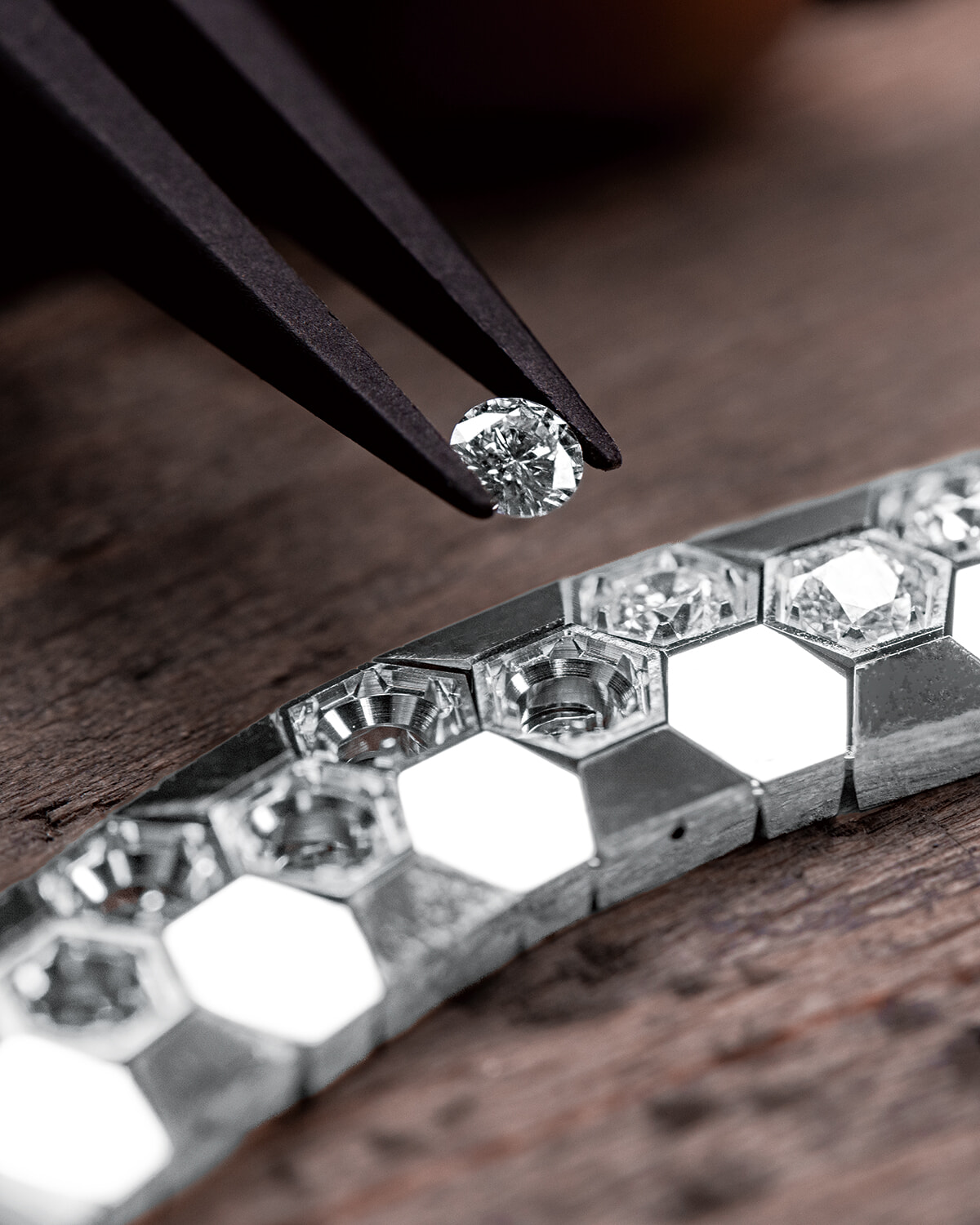 ハニカムモチーフをあしらったブレスレットを手に取ってみると、驚くほどしなやか。小さなハニカム状のパーツを丁寧な職人技でリンクさせ、手首に柔らかくフィットする仕立てを実現しているのだ。しかも、そのパーツを丹念なポリッシュで仕上げているので、ひとつひとつのハニカムが鏡のような光沢で輝く。身体の動きにつれて白い光を反射し、質の高いダイヤモンドの煌めきも加わって、しっかりとした存在感があるブレスレットになっている。