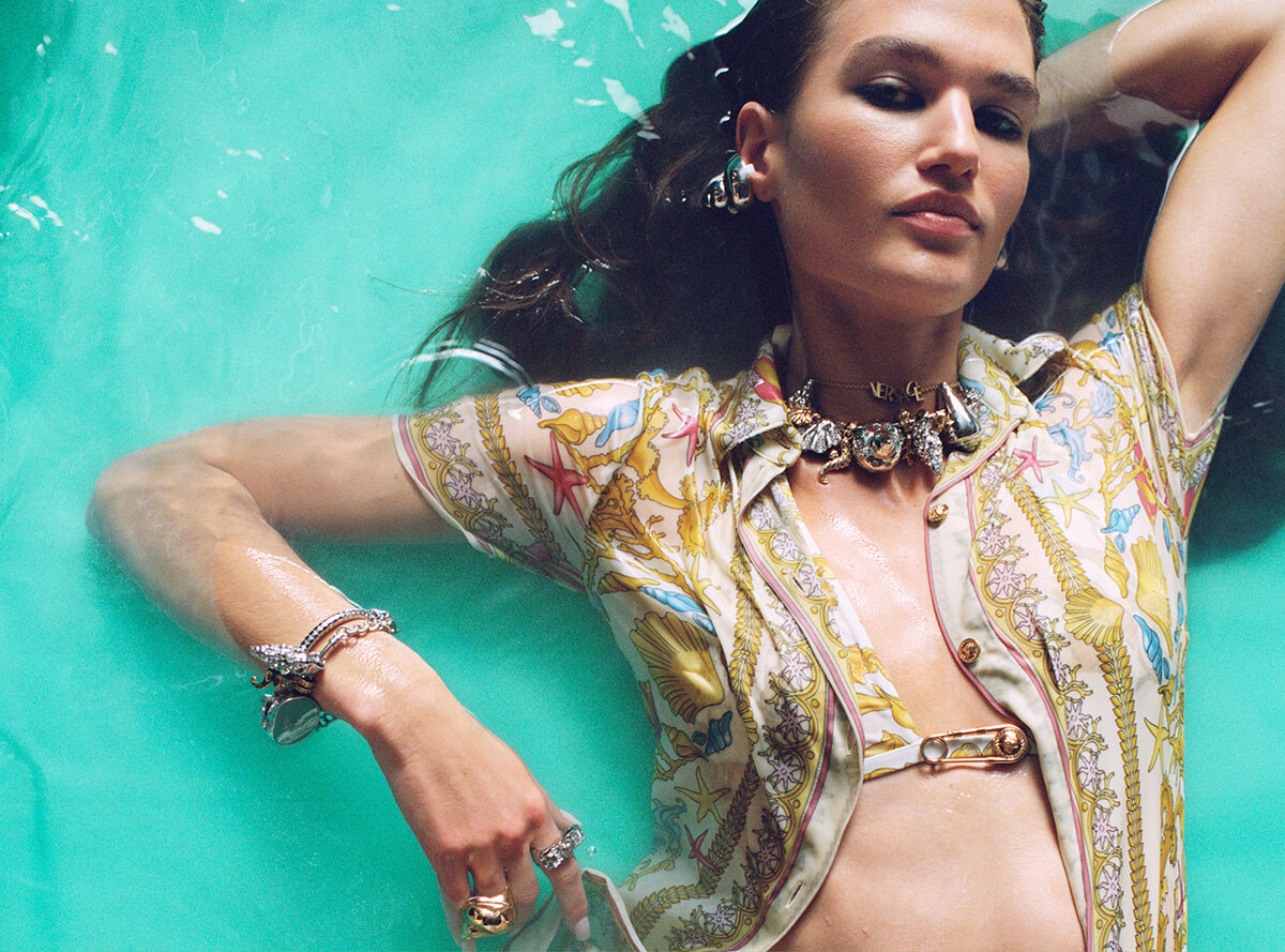 「ラ ヴァカンツァ」コレクションは、1992年の春夏コレクションでヴェルサーチェが発表した「トレゾール・ドゥ・ラ・メール」に描かれた地中海の海辺の文化をモチーフにした象徴的なパターンをアレンジ。その海を中心としたモチーフは、海洋保護とコーラル ガーデナーズへの支援に対するメゾンのコミットメントのシンボルとなっている。