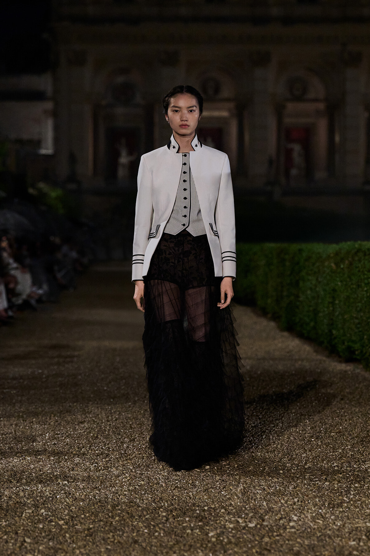 フェミニンなフリルやレースといったディテールとともに、肩を尖らせたドラマティックなトレンチコートや海軍の制服を連想させるジャケットなど、ミリタリーの要素を取り入れたルックも登場。いずれにしても、ロマンティックなロングスカートやドレスとスタイリングし、コントラストを際立たせている。