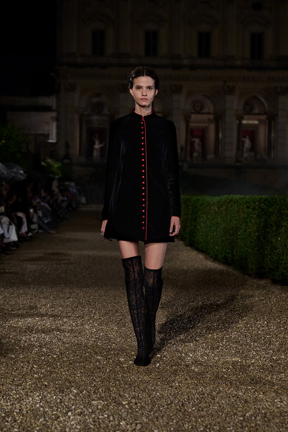 永遠の都であり、キウリの故郷でもあるローマ。本コレクションではローマへの愛と、ところどころにそれを表現するための遊び心が宝石のように光る。例えば、コンクラーベのニュースが記憶に新しいが、枢機卿の衣装を思わせるミニドレス、フェリーニの映画『甘い生活』でヒロインのドレスをデザインしたフォンタナ姉妹へオマージュを捧げたベルベットのドレス、歴史的な建築物のレリーフや庭園の草花をスケッチしたようなプリント……。キウリは彼女ならではのユニークな方法で、ローマの人物、風景、芸術、物語、そして神話を再構築したのだ。