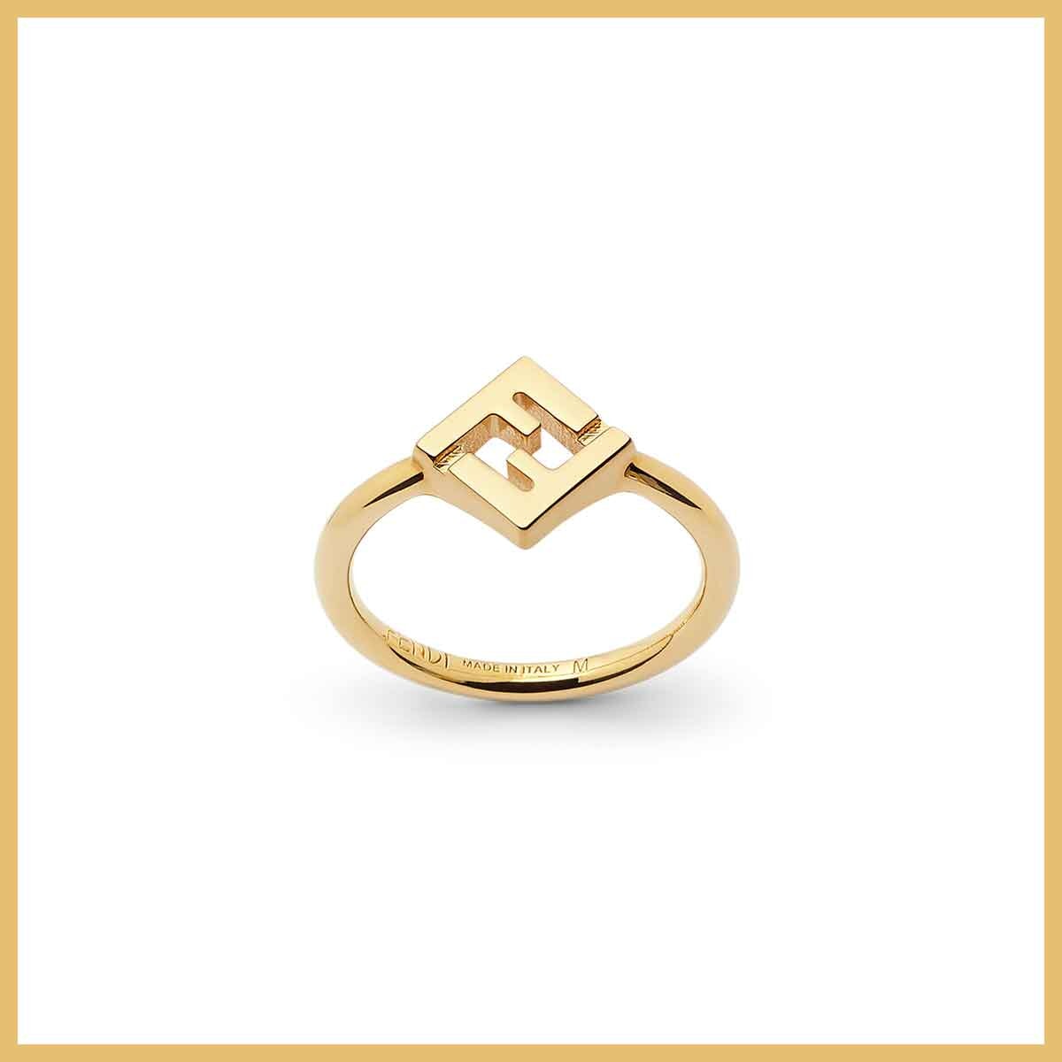 カットアウトの「FF」ロゴキューブをあしらったリング。肌馴染みの良いゴールドで品の良さを引き立てる、シンプルで華奢なデザイン。