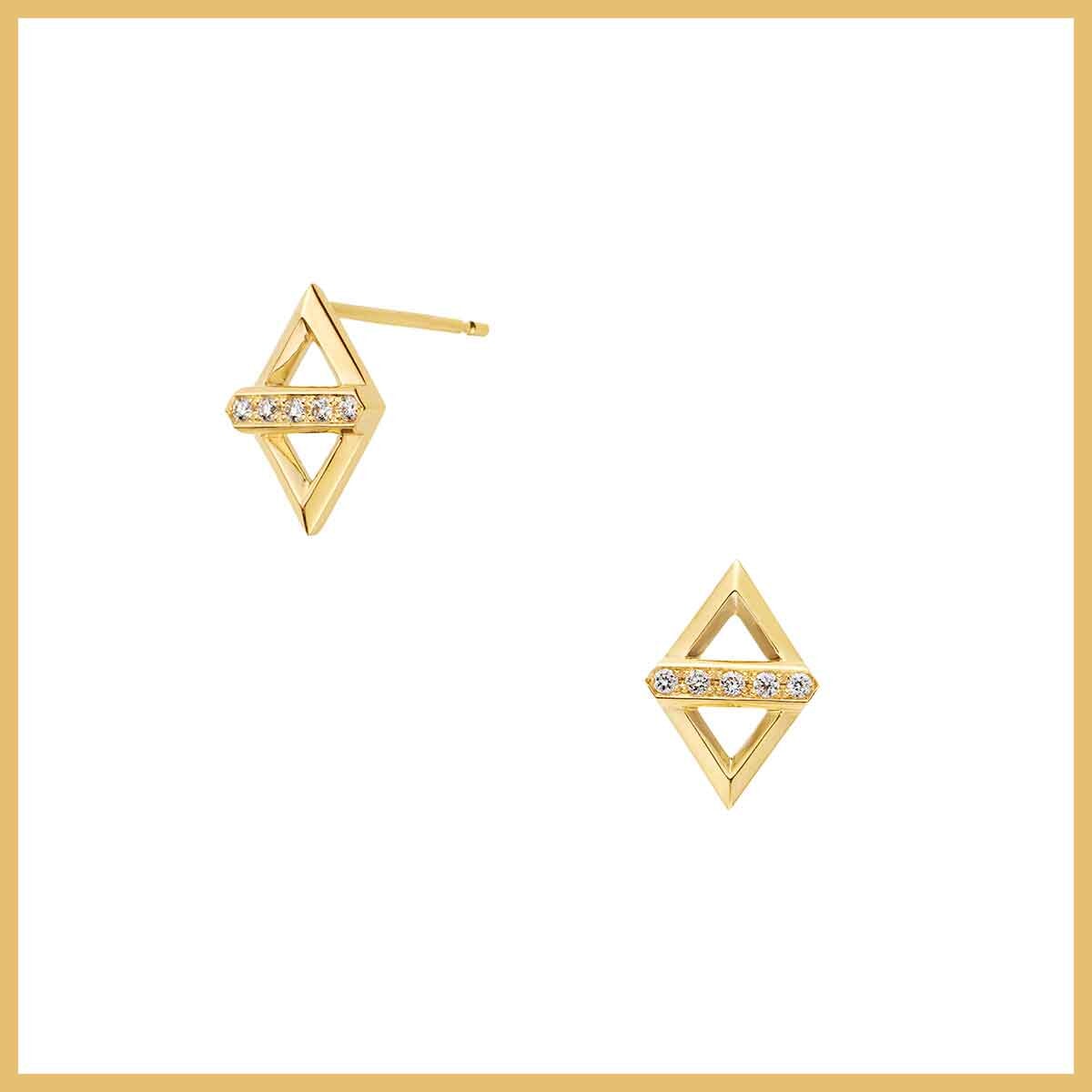構築的なひし形フォルムに立体的なダイヤモンドのライン。横顔をスタイリッシュに導くピアスでエッジを効かせて。