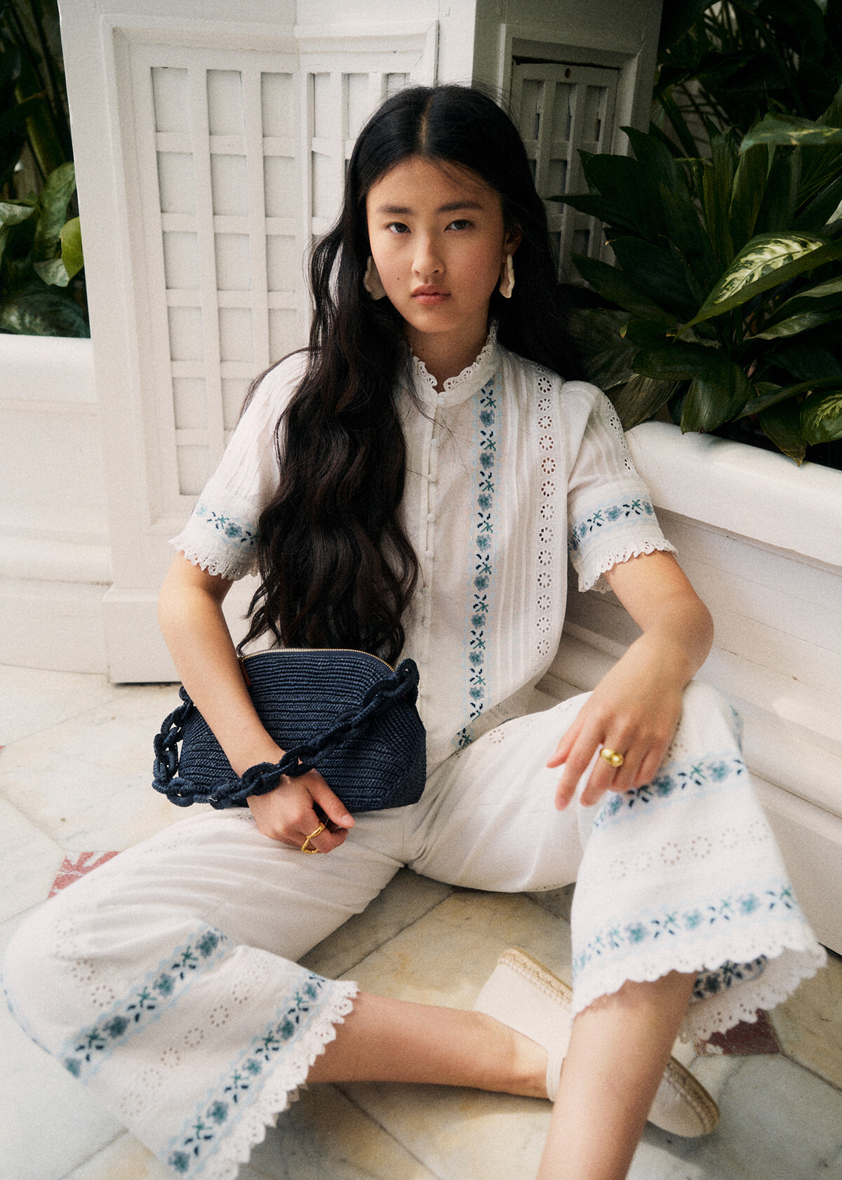 「セザンヌ × アンディオン Mustina ブラウス」¥20,000、「同 Alexis パンツ」¥24,000(ともに6月上旬発売)、バスケット¥60,000、エスパドリーユ¥18,000、ピアス¥11,000/以上セザンヌ